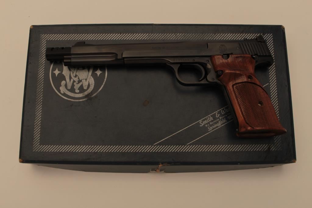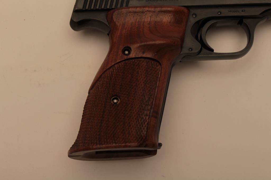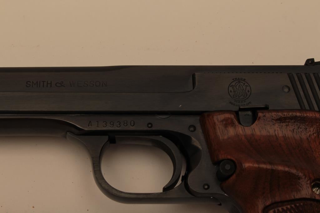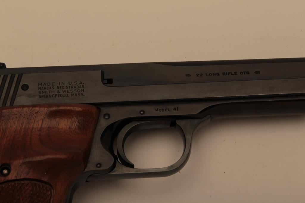 Smith & Wesson Model 41 semi-automatic target pistol, .22LR caliber, 8-3/8” barrel, blued finish, checkered wood target grips, one extra magazine, S/N A139380; in overall like new condition with factory two piece cardboard box and end label numbered to this gun. (Modern/NO CAL. SALE). Est.: $700-$1,400.