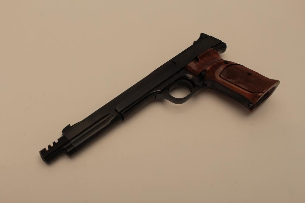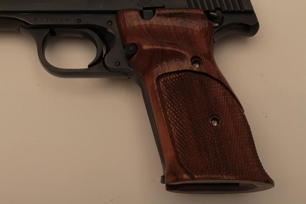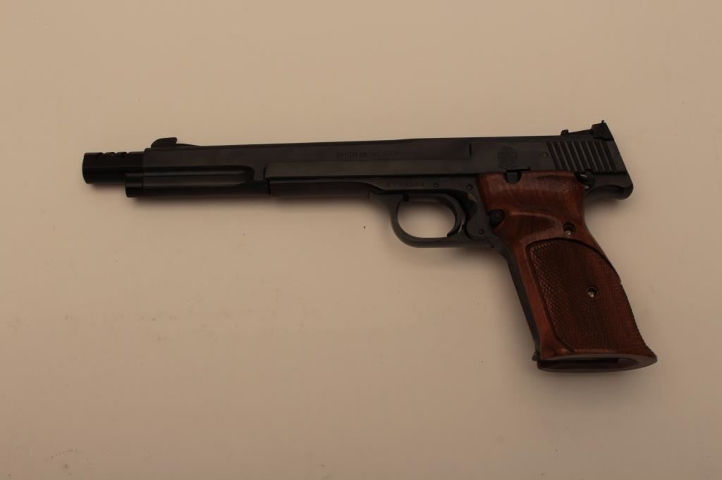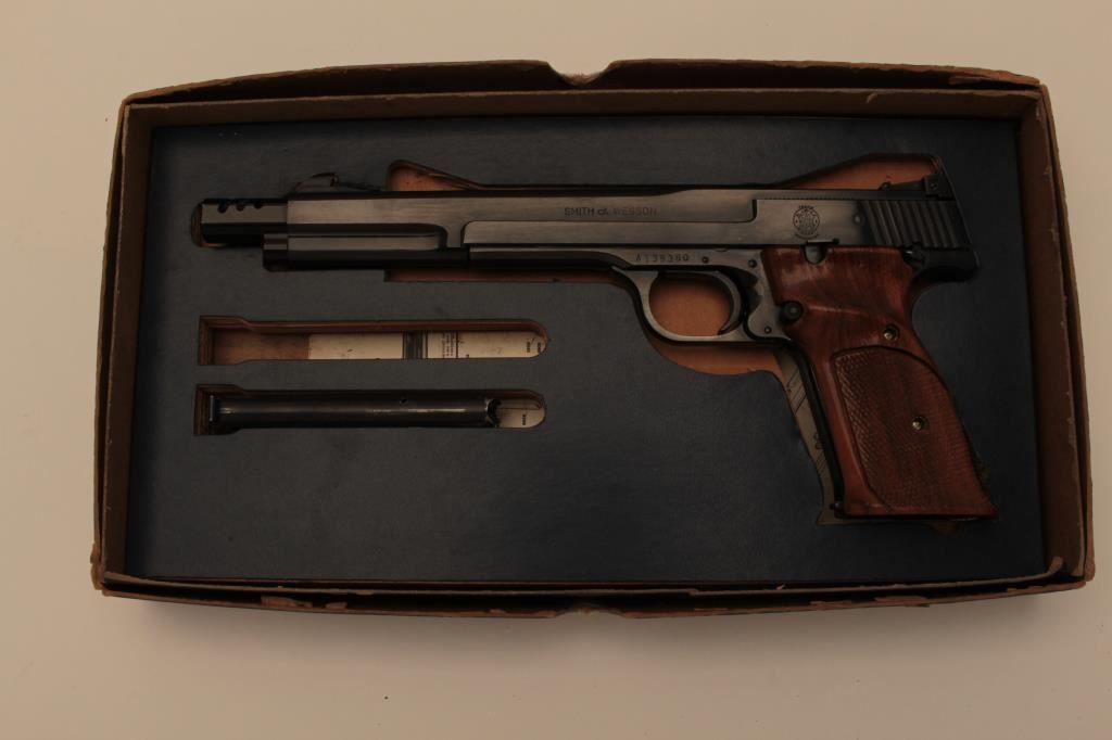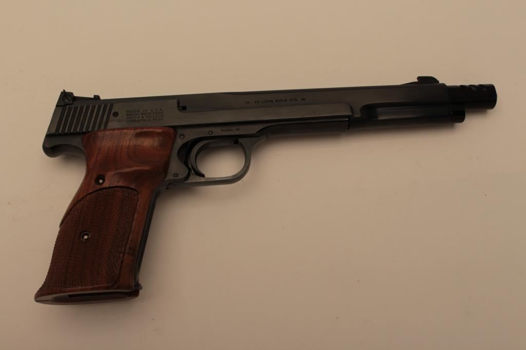 Smith & Wesson Model 41 semi-automatic target pistol, .22LR caliber, 8-3/8” barrel, blued finish, checkered wood target grips, one extra magazine, S/N A139380; in overall like new condition with factory two piece cardboard box and end label numbered to this gun. (Modern/NO CAL. SALE). Est.: $700-$1,400.