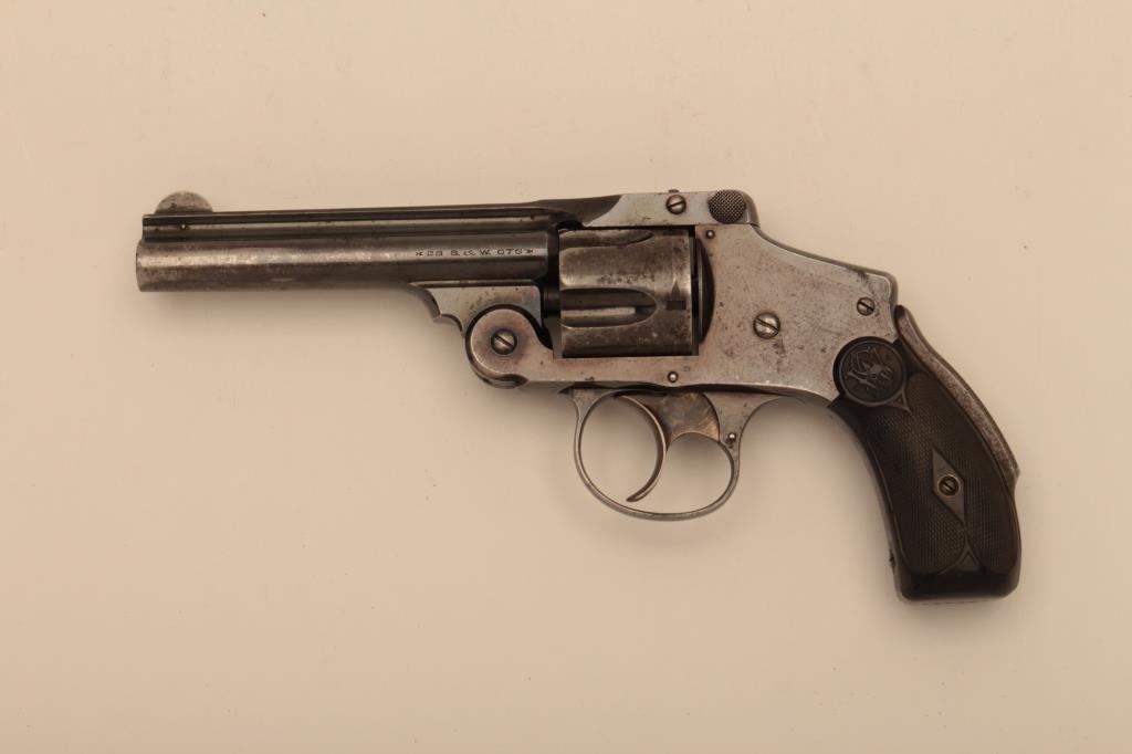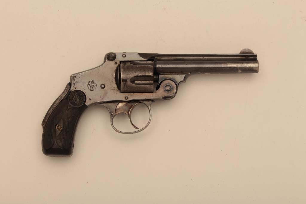Smith & Wesson New Departure top break DA revolver, .38 S&W caliber, 4” barrel, blued finish, checkered hard rubber grips, S/N 140162; considerable original blued finish remaining; near fine bore, crisp action and markings, very good + grips. (C&R/NO PPT). Est.: $250-$500.