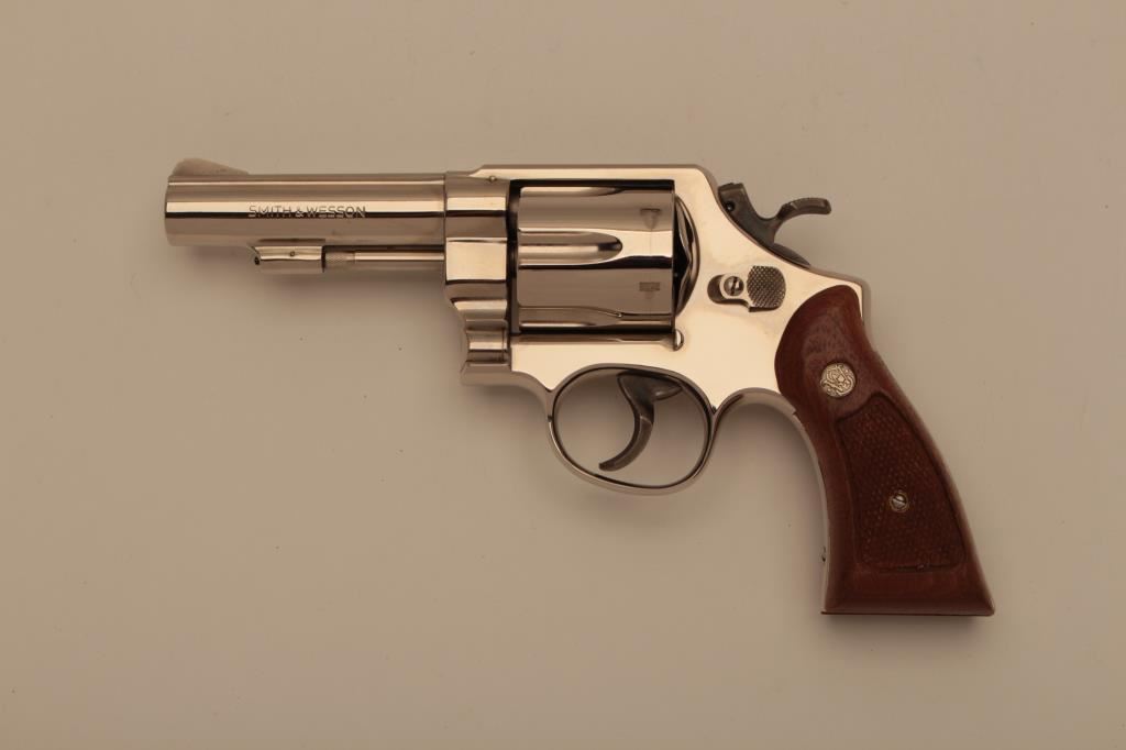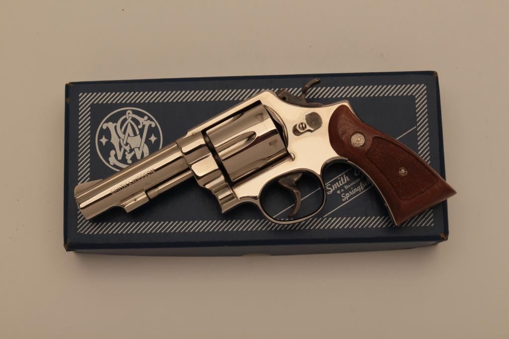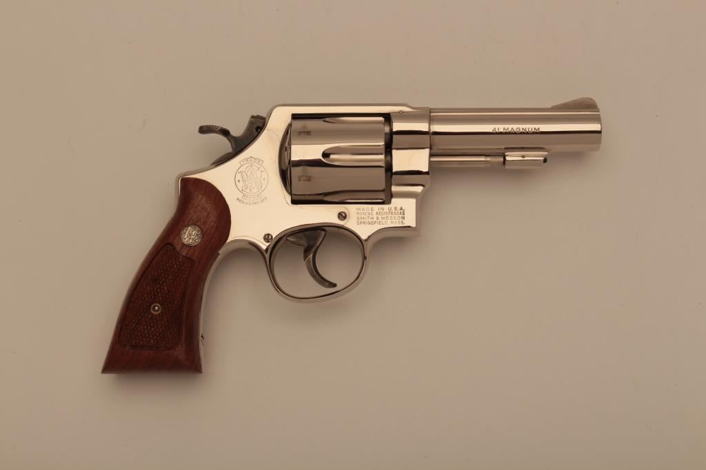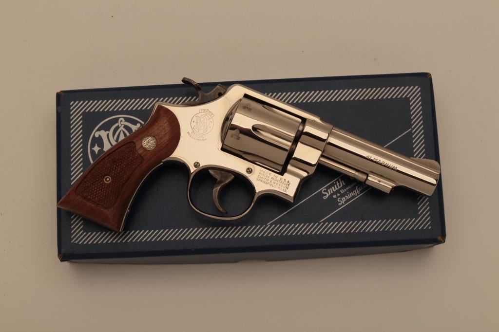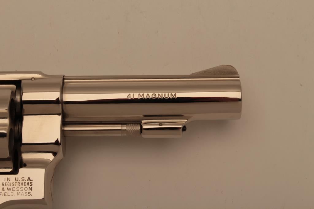 Smith & Wesson Model 58 DA revolver, .41 Magnum caliber, 4” heavy barrel, nickel finish, checkered wood medallion grips, S/N N272151; like new condition with factory two piece cardboard box. (Modern/NO CAL. SALE). Est.: $600-$1,200.