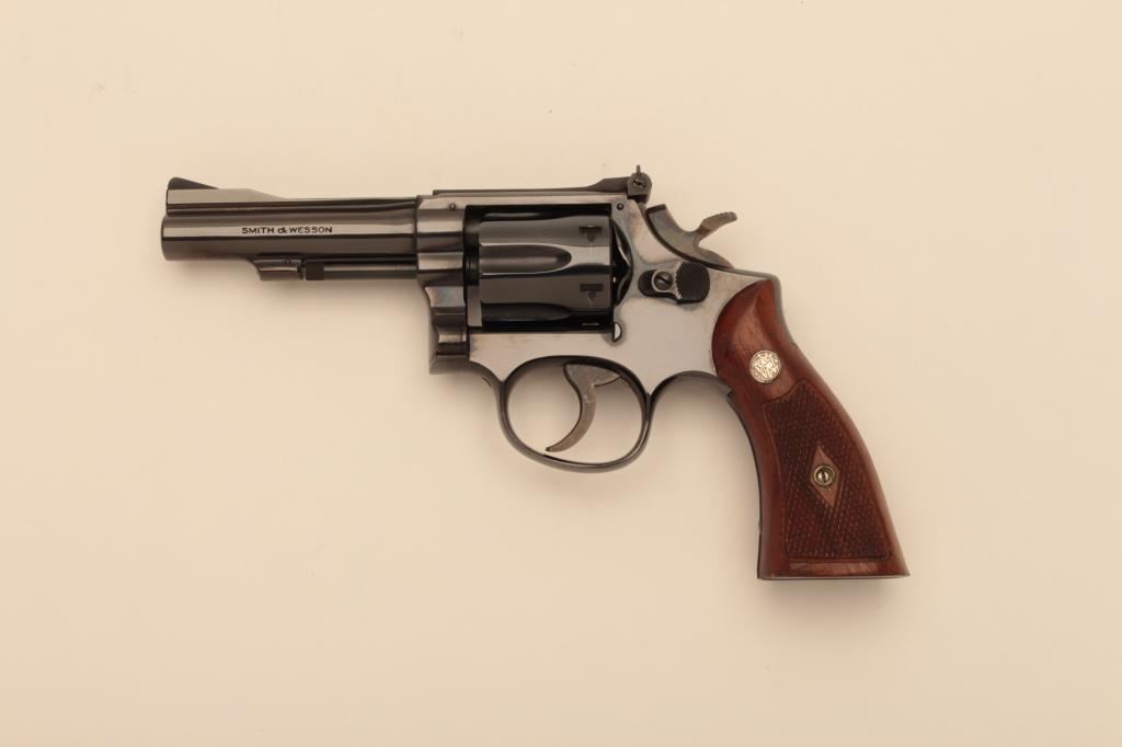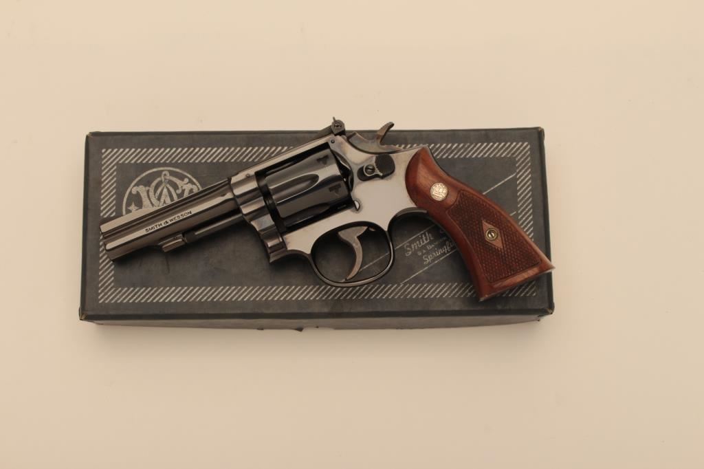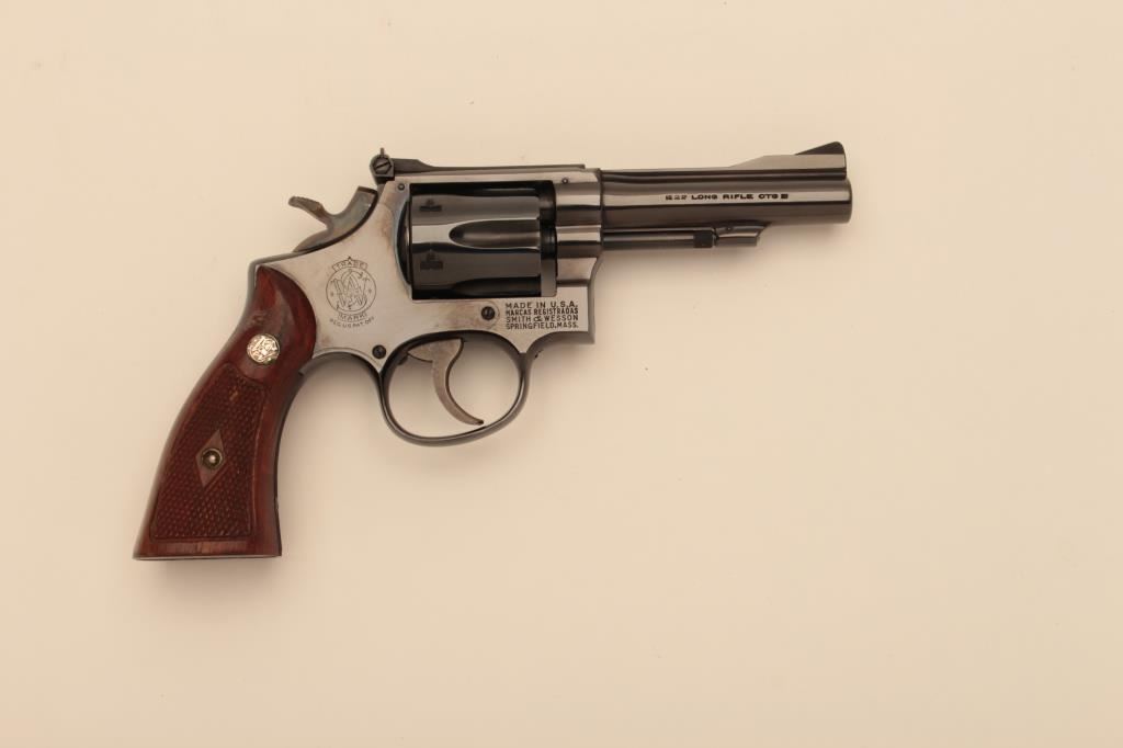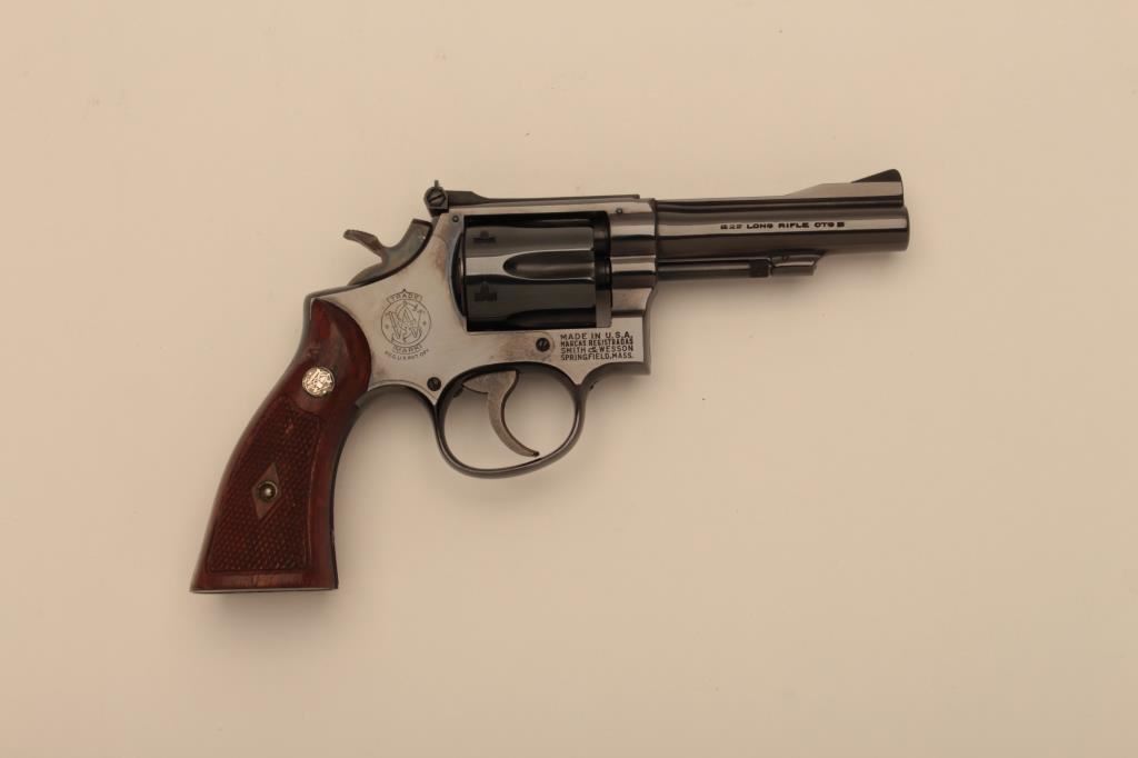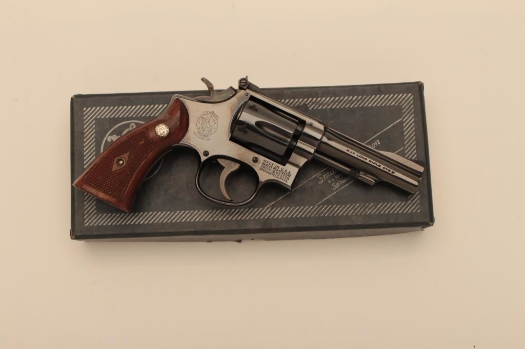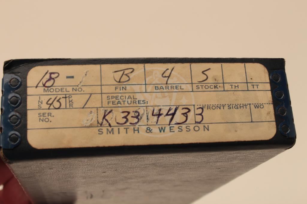 Smith & Wesson Model 18 (no dash) DA revolver, .22LR caliber, 4” barrel, blued finish, checkered wood medallion grips, S/N K334433; like new condition and contained in a factory two piece cardboard box. (C&R/NO PPT). Est.: $750-$1,500.