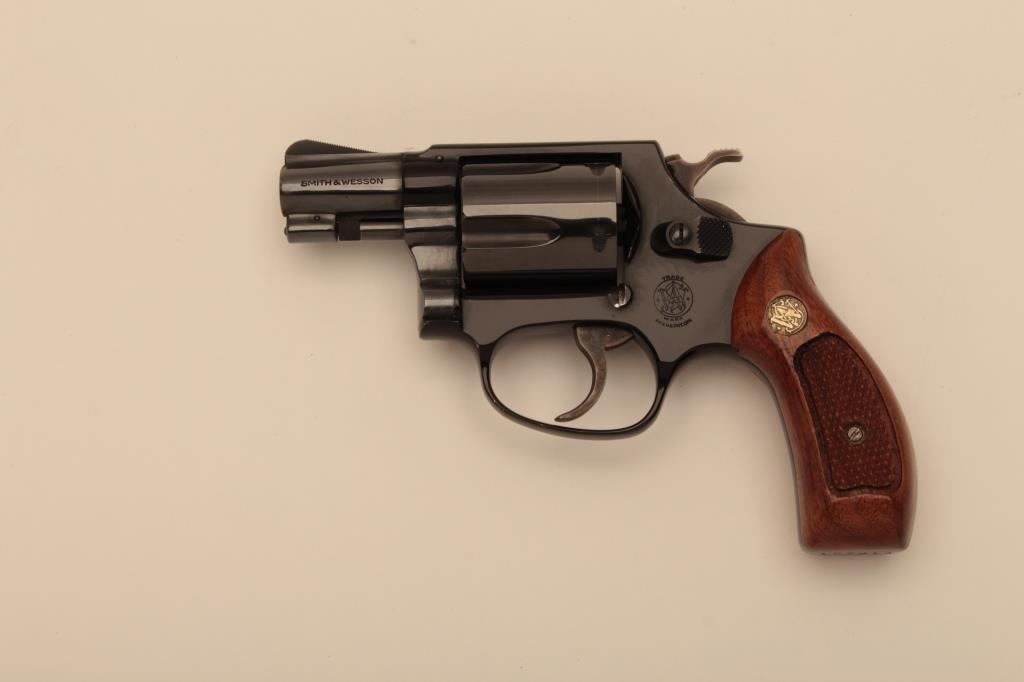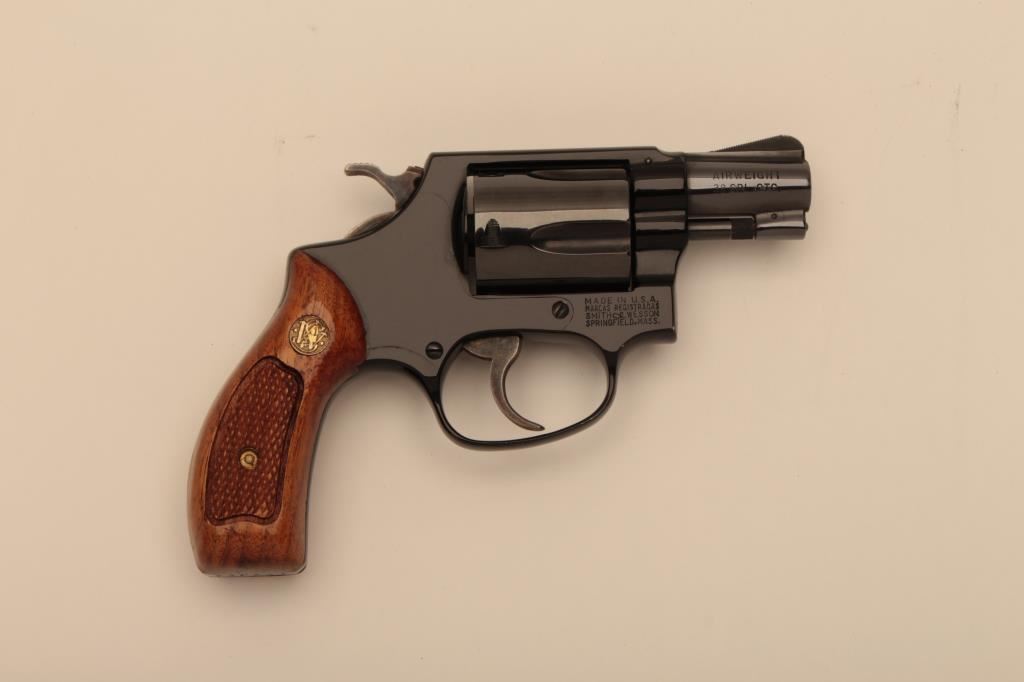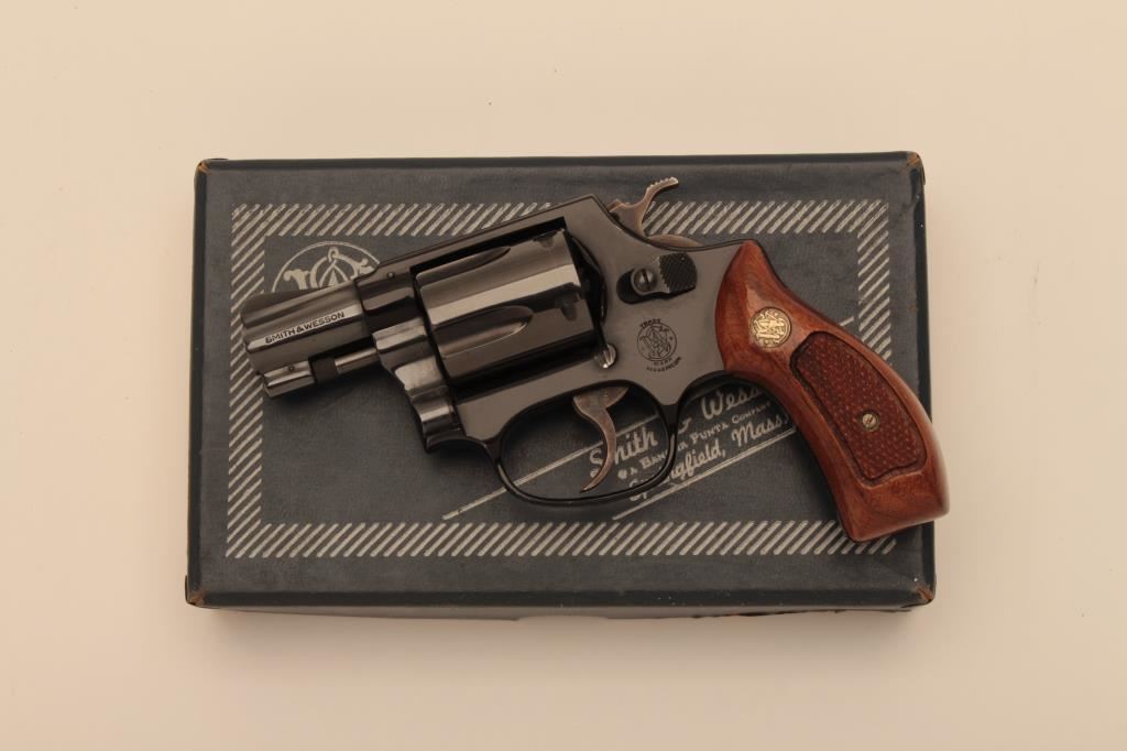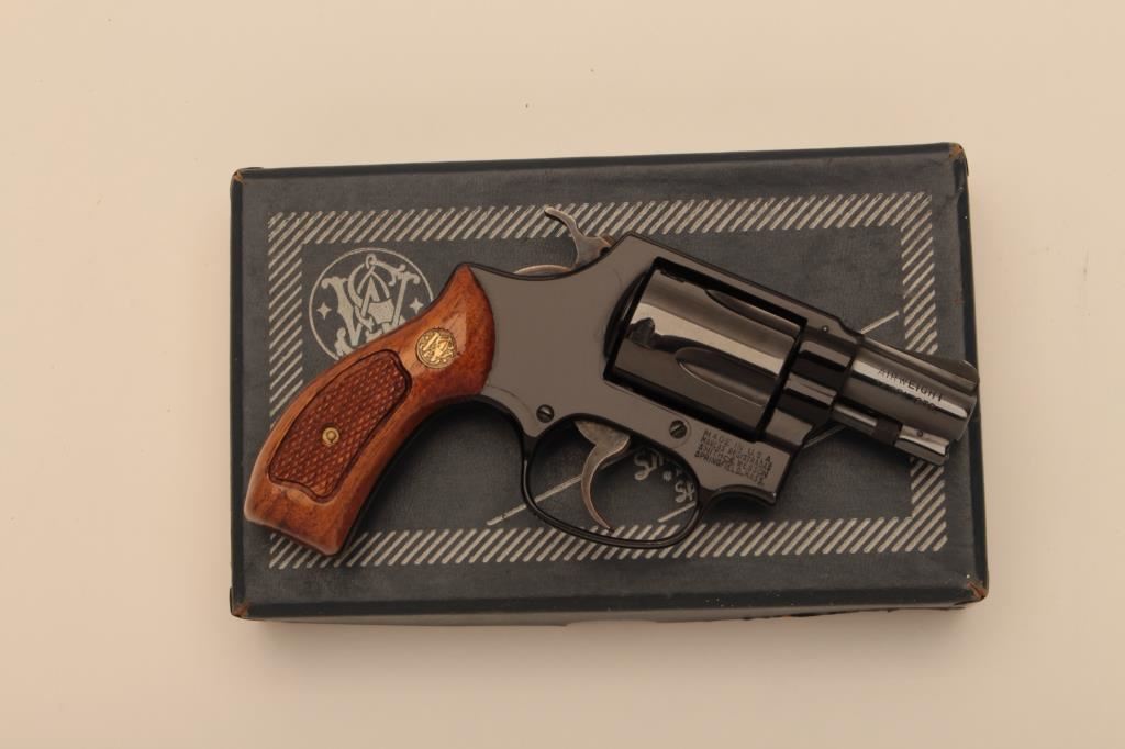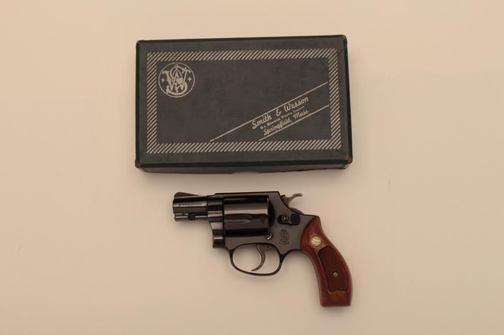 Smith & Wesson Model 37 Airweight DA revolver, .38 Special caliber, 2” barrel, blued finish, checkered wood medallion grips, S/N 197J14; like new condition with factory two piece cardboard box. (Modern/NO CAL. SALE). Est.: $500-$1,000.