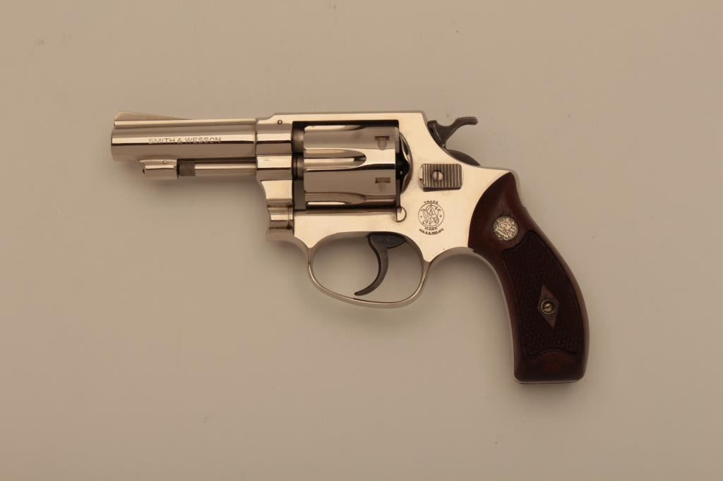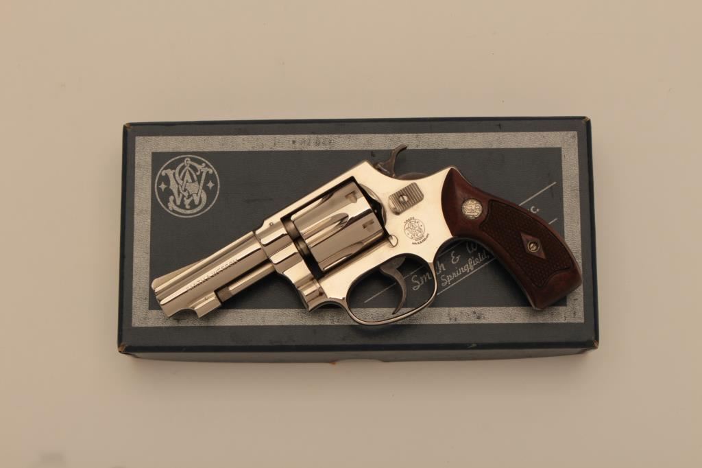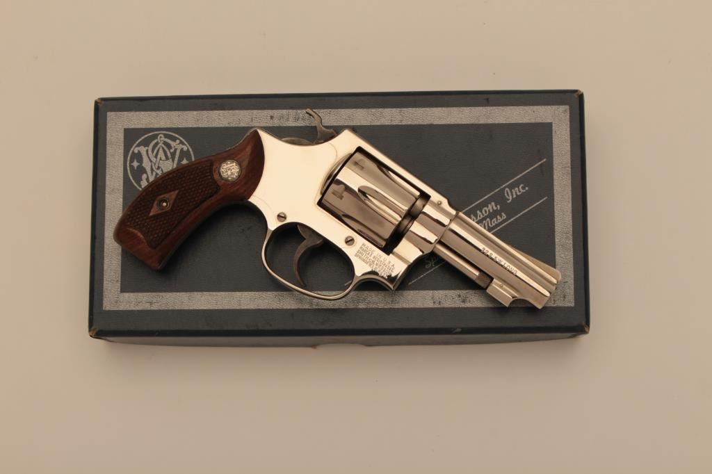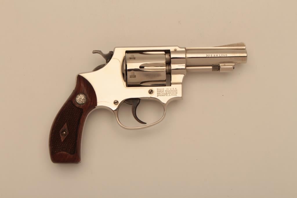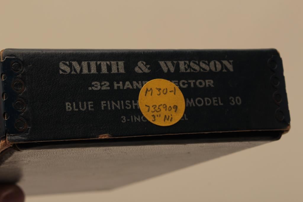 Smith & Wesson Model 30-1 DA revolver, .32 S&W Long caliber, 3” barrel, nickel finish, checkered wood medallion grips, flat latch, S/N 735909; overall near new condition with factory two piece cardboard box. (C&R/NO PPT). Est.: $400-$800.