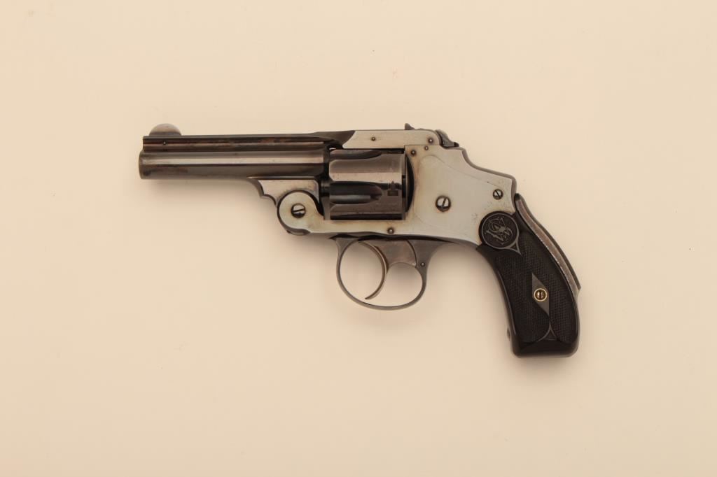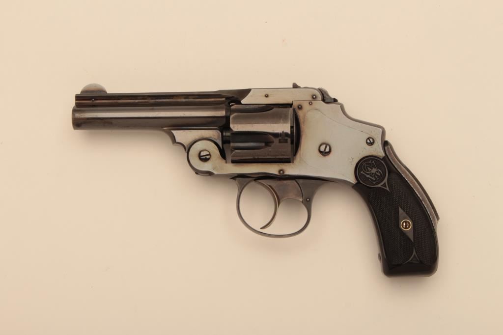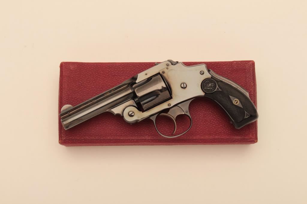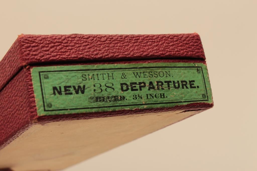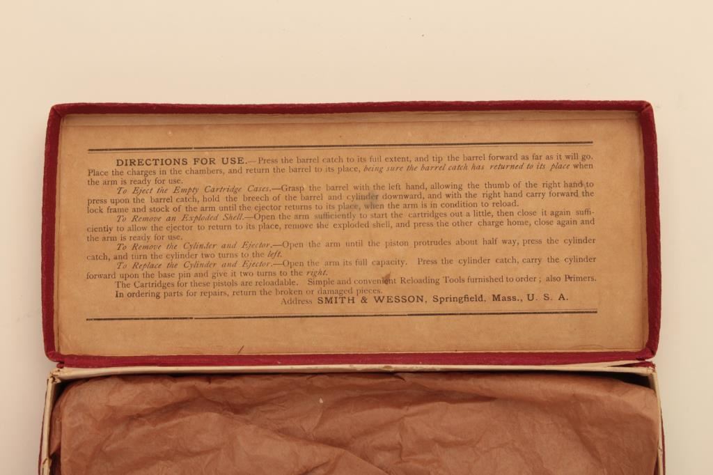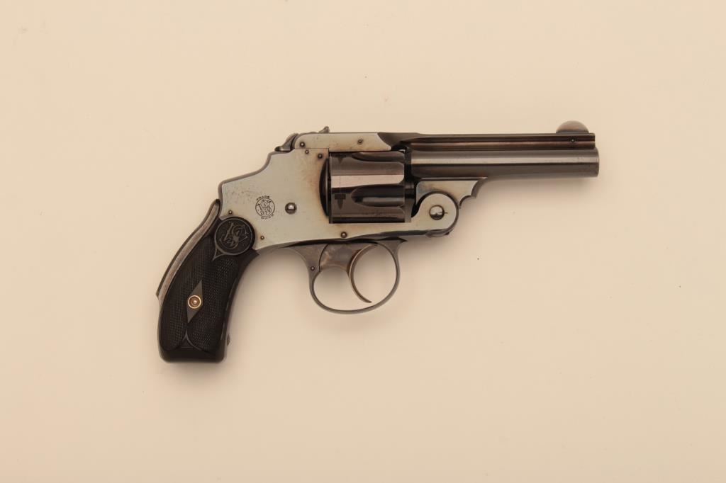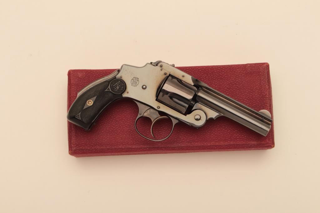 Smith & Wesson 38 Safety Third Model top break New Departure DA revolver, .38 caliber, 3.25” barrel, blued finish, checkered hard rubber grips, S/N 113309; overall excellent condition with some scattered minor flaking of original finish, excellent bore, action, markings and grips; accompanied by a factory fabric covered cardboard box with correct end label. (Antique). Est.: $350-$700.
