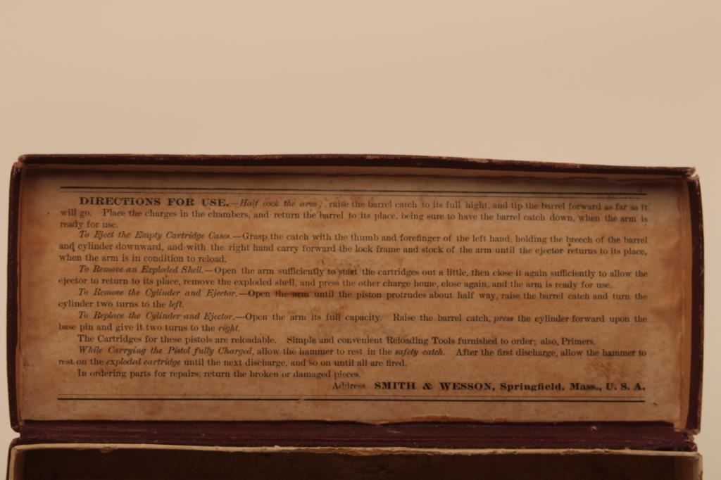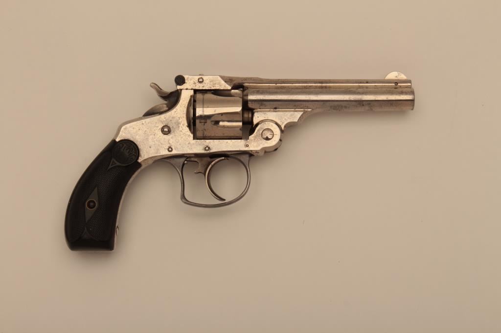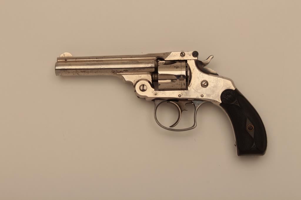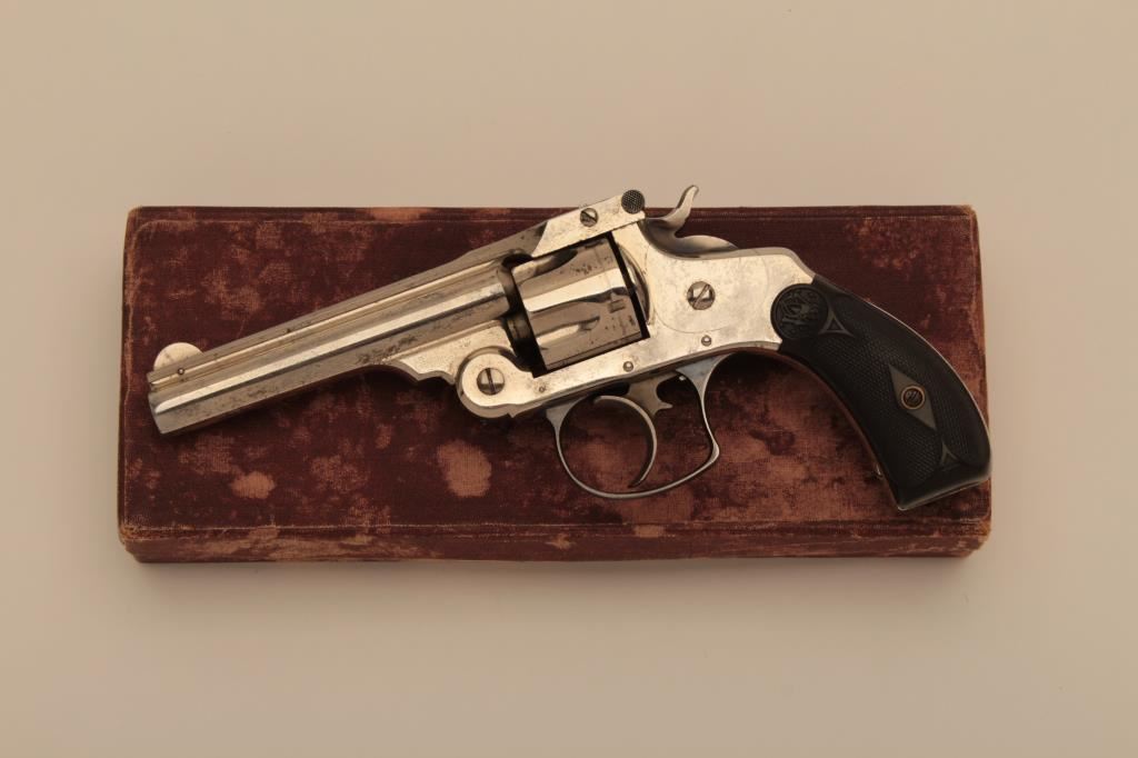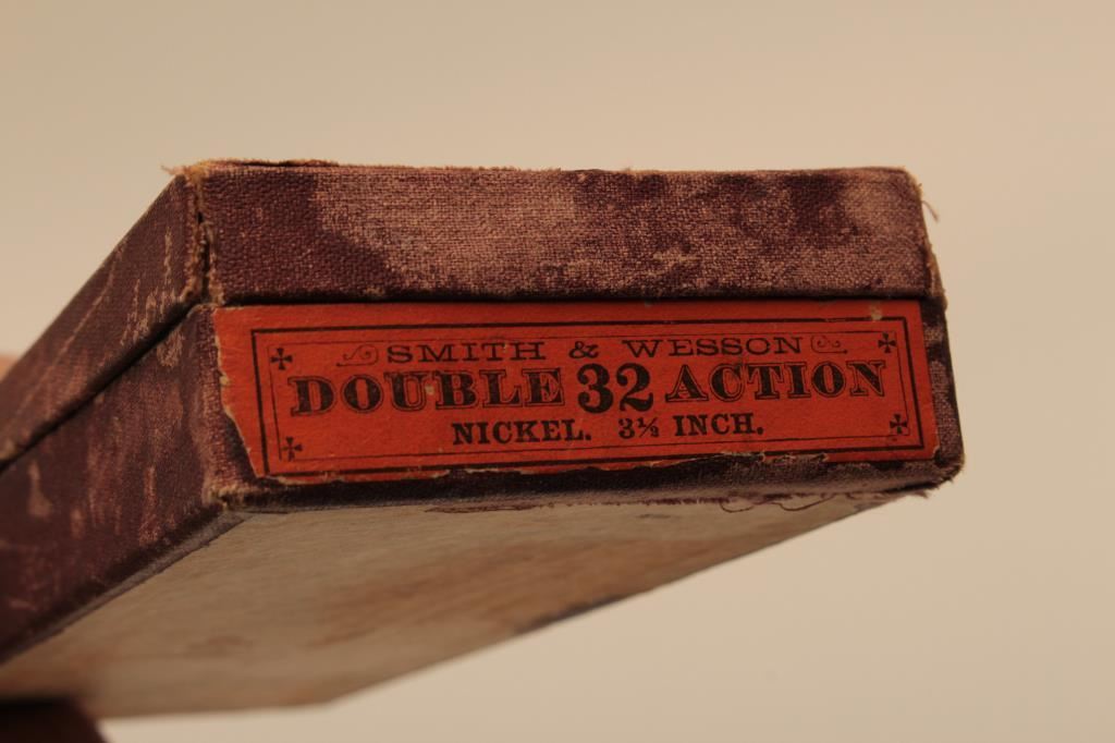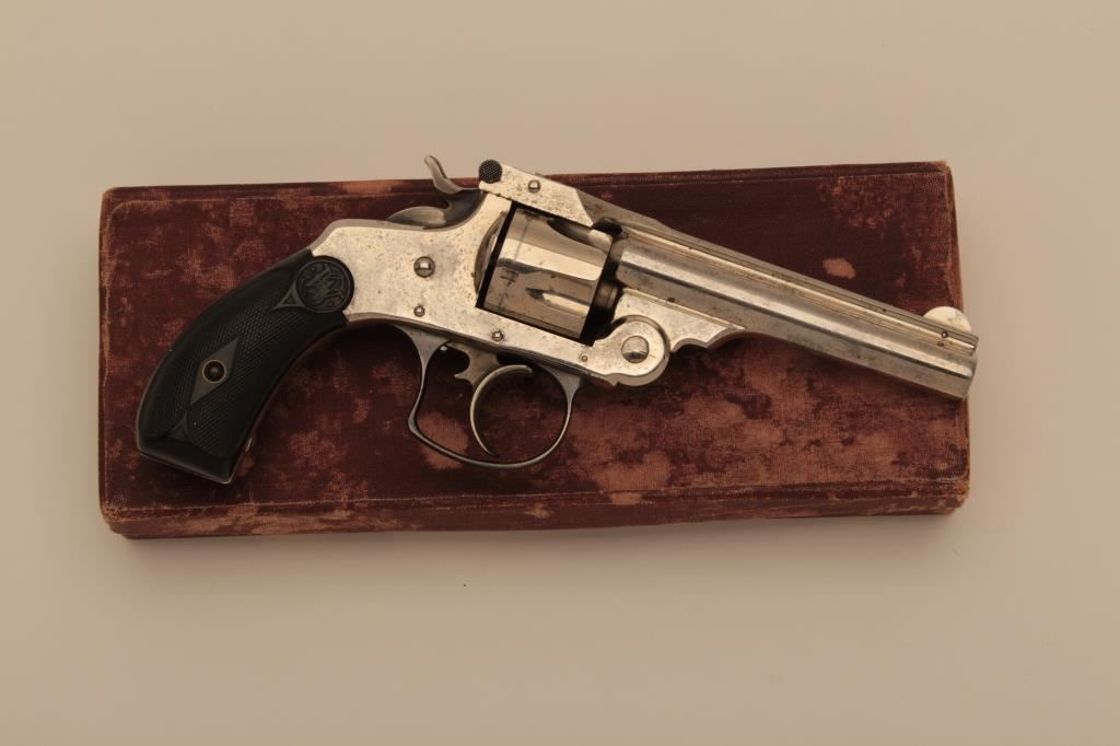 Smith & Wesson top break DA revolver, .32 caliber, 3.5” barrel, nickel finish, checkered hard rubber grips, S/N 22776; overall in very good to fine condition displaying majority of its original nickel finish, crisp action, sharp markings, good bore and fine grips; accompanied by a fabric covered factory cardboard box with correct end label. (Antique). Est.: $300-$600.