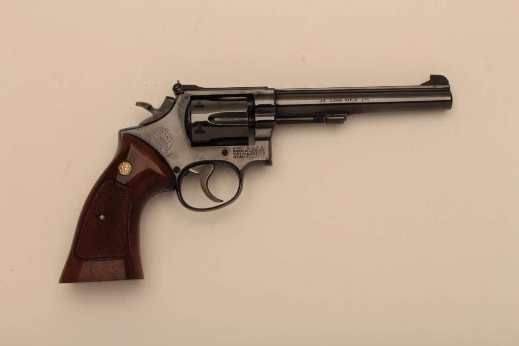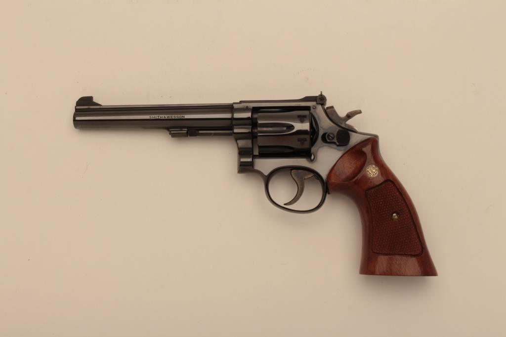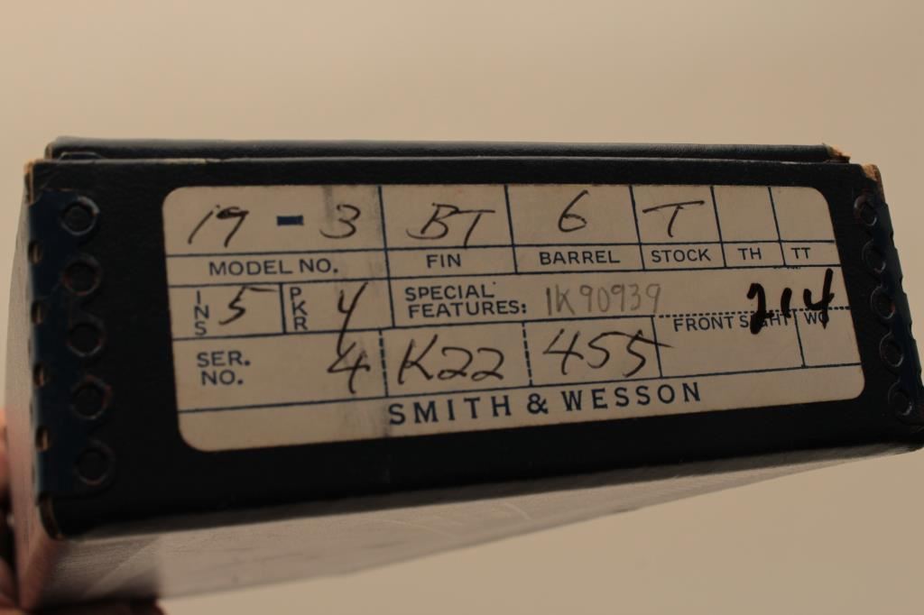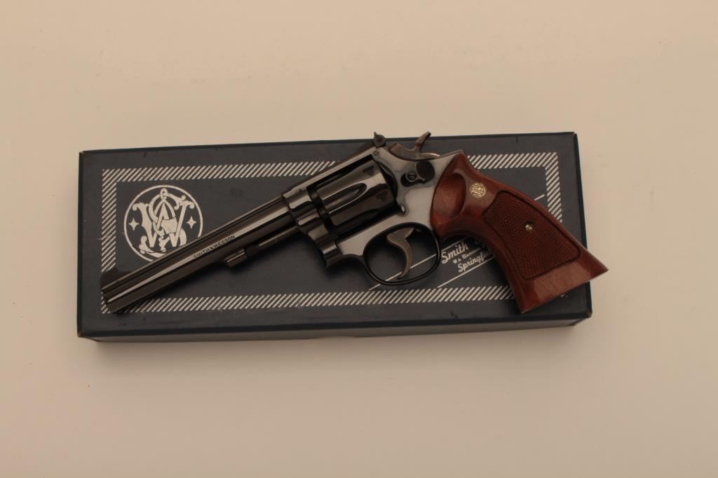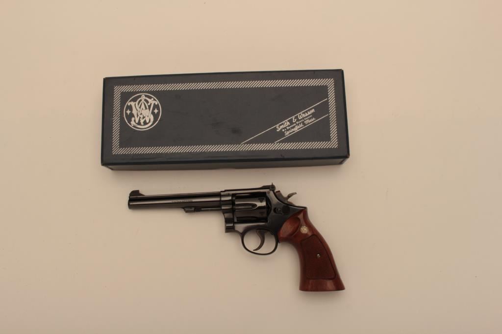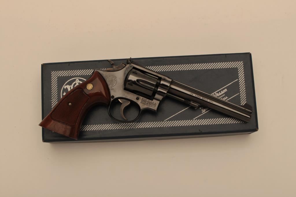 Smith & Wesson Model 17-3 DA revolver, .22LR caliber, 6” barrel, blued finish, checkered wood medallion combat grips, S/N 1K90939; overall near new condition with factory two piece cardboard box. (Modern/NO CAL. SALE). Est.: $400-$800.