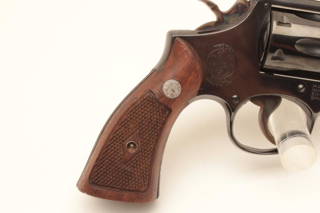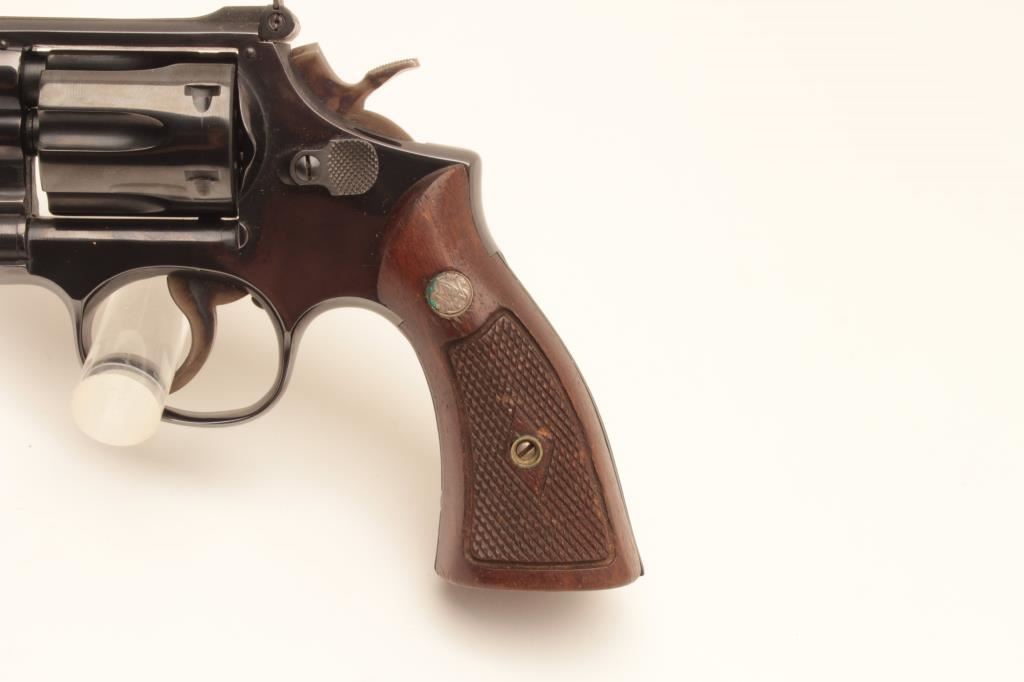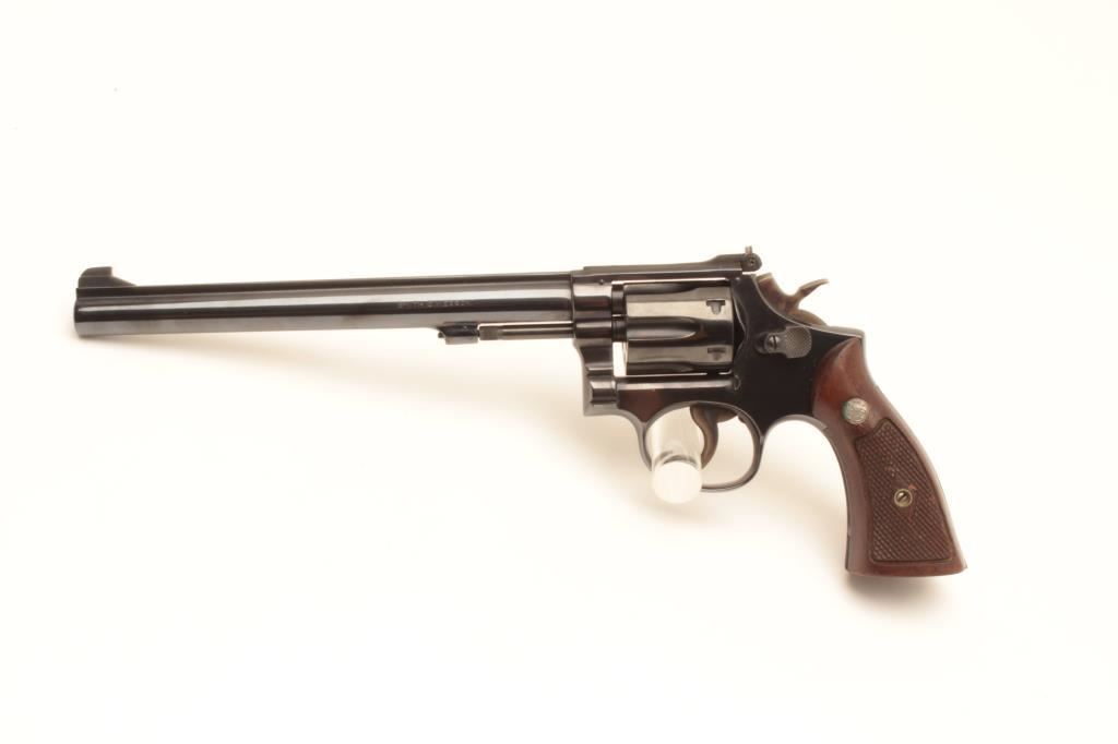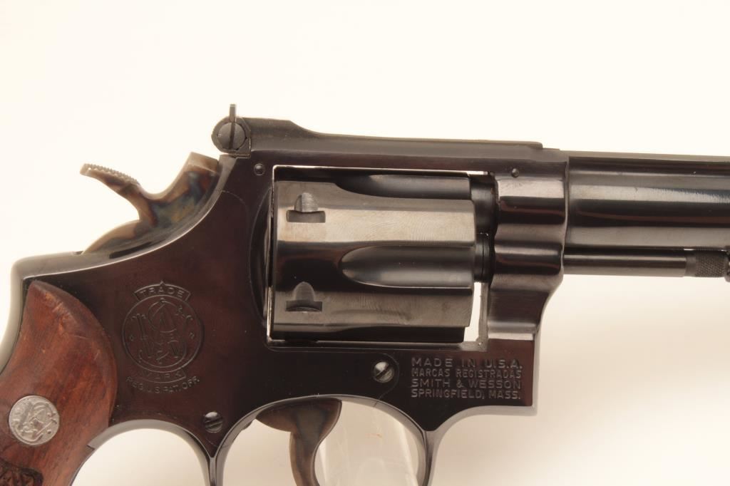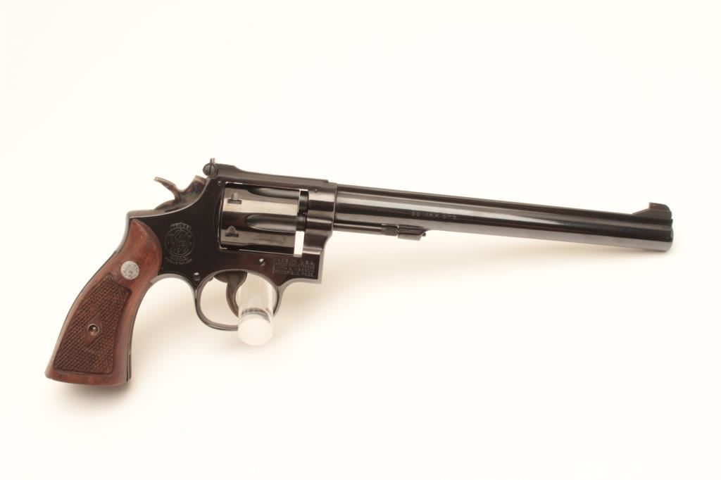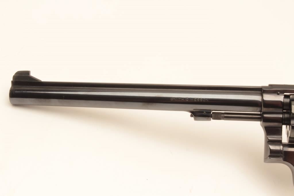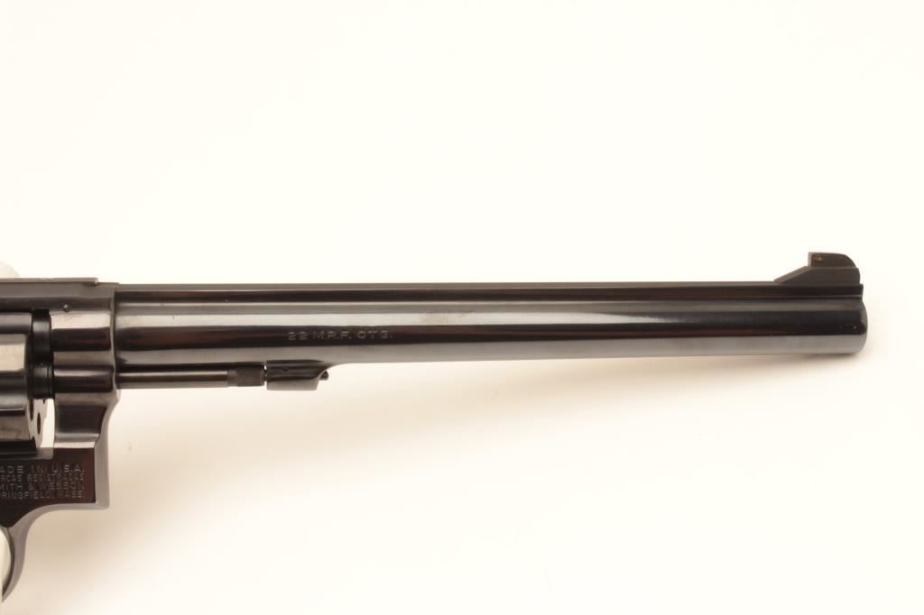 Smith & Wesson Model 48 (no dash) DA revolver, .22 M.R.F. caliber, 8-3/8” barrel, blued finish, checkered wood medallion grips, S/N 5K91981; like new in factory two piece cardboard box with end label numbered to this gun; cleaning tool included. (Modern/NO CAL. SALE). Est.: $700-$1,400.