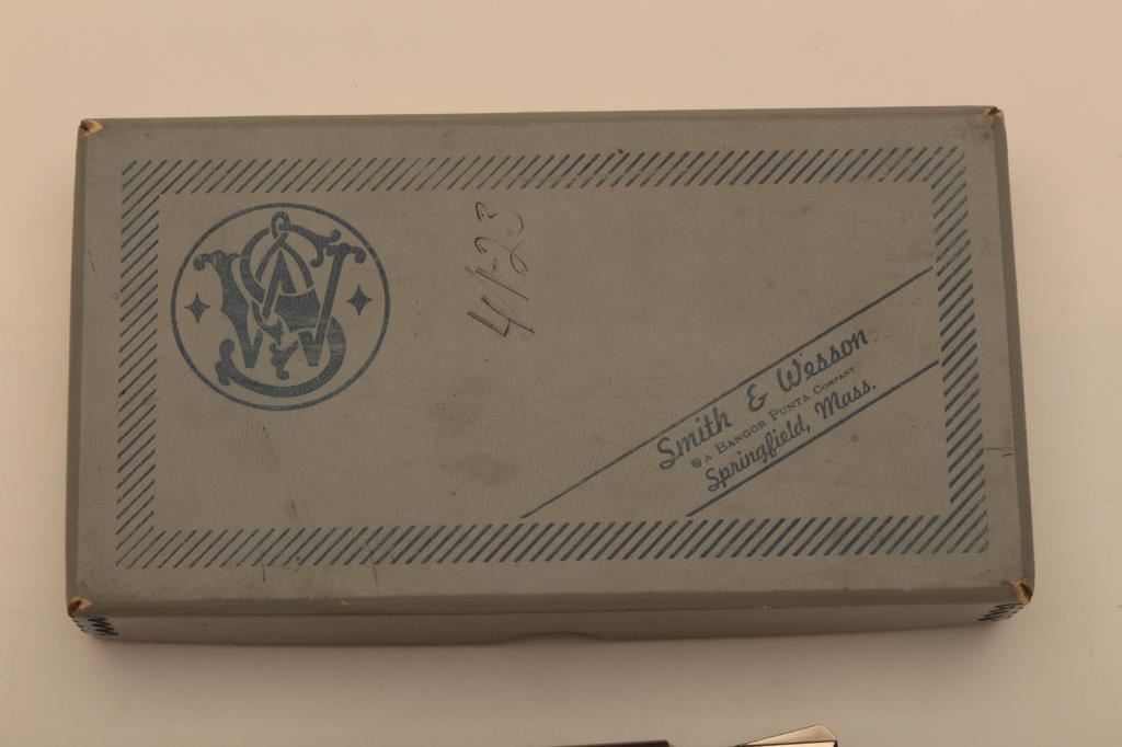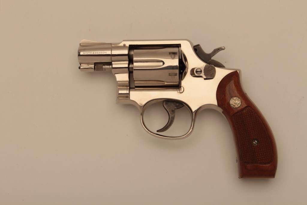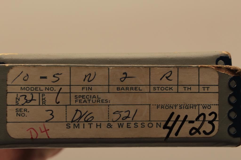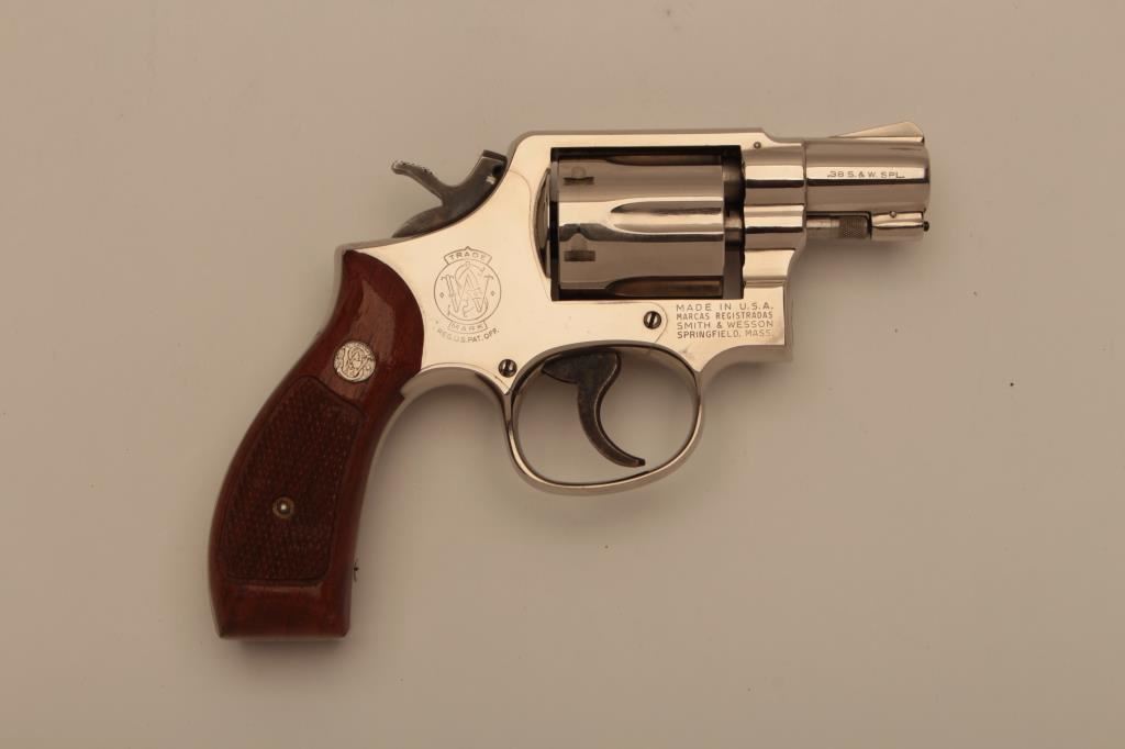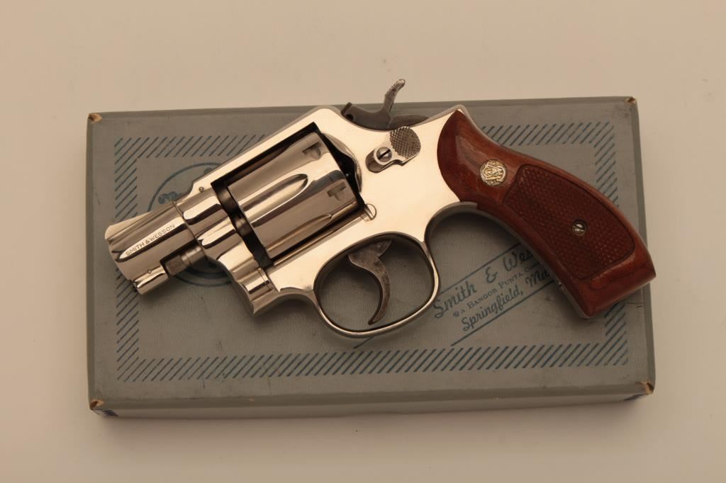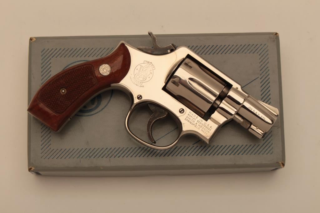 Smith & Wesson Model 10-5 DA revolver, .38 Special caliber, 2” barrel, nickel finish, checkered wood medallion grips, S/N 3D16521; excellent overall showing minimal use; accompanied by a factory two piece silver and blue cardboard box with end label numbered to this gun and instructions sheet. (Modern/NO CAL. SALE). Est.: $400-$800.