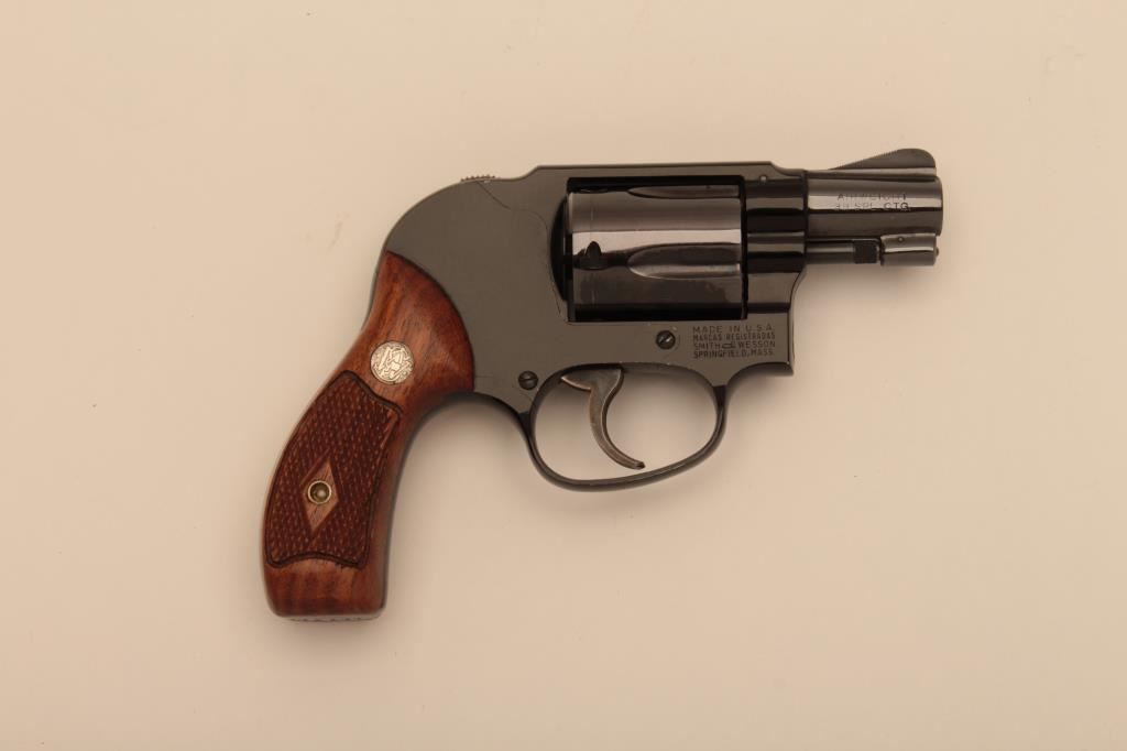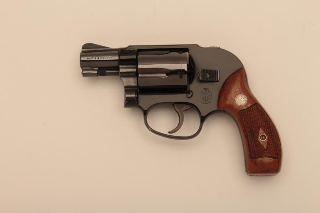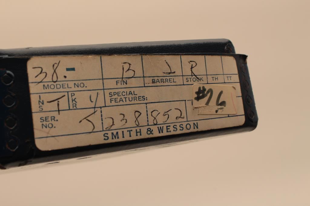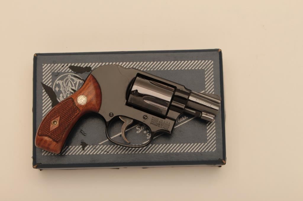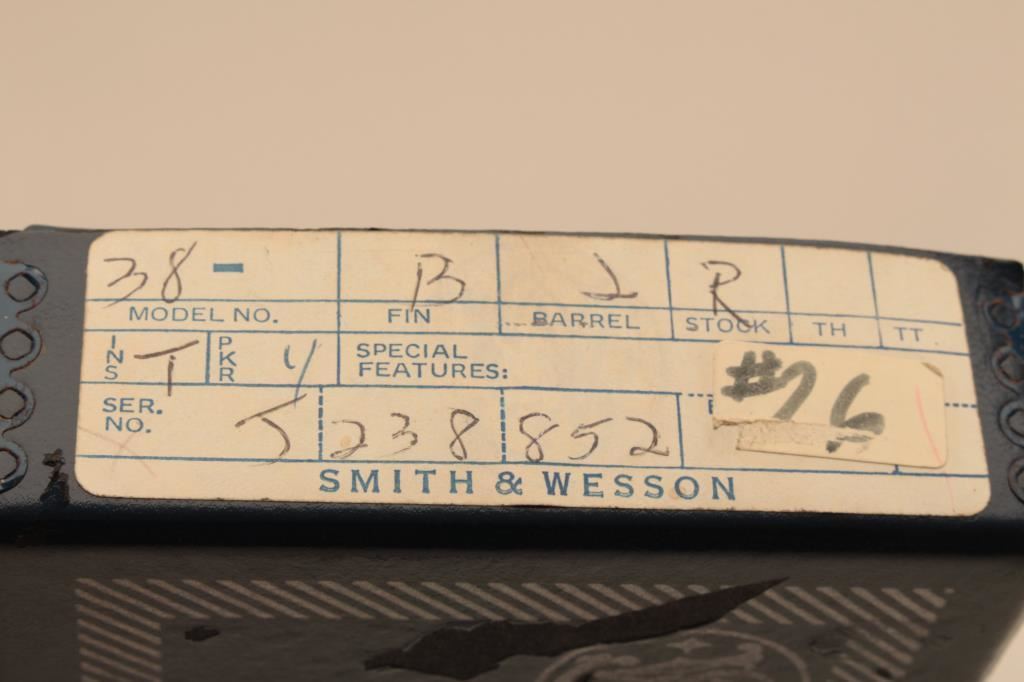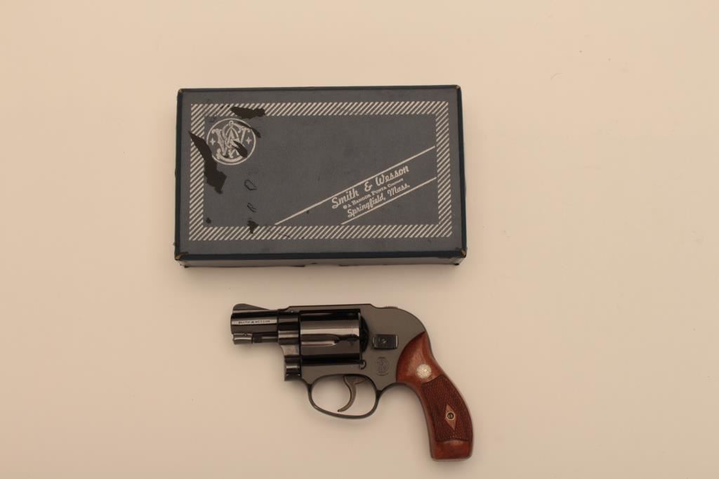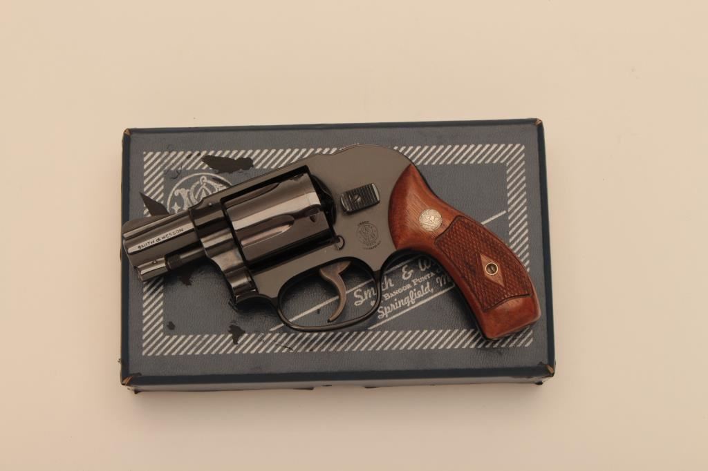 Smith & Wesson pre-Model 38 Airweight DA revolver, .38 Special caliber, 2” barrel, blued finish, checkered wood medallion grips, S/N 117314; flat latch; like new condition with factory two piece cardboard box. (C&R/NO PPT). Est.: $400-$800.