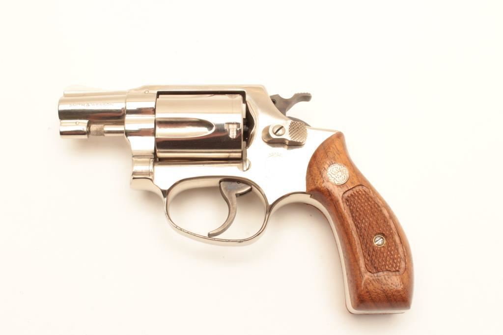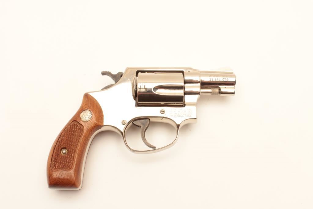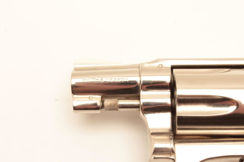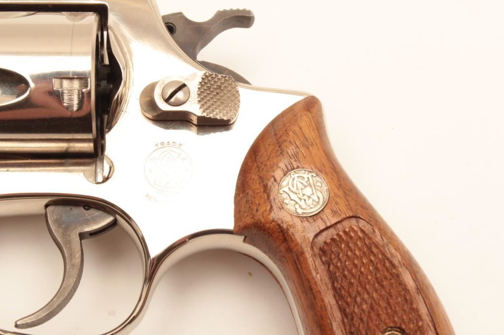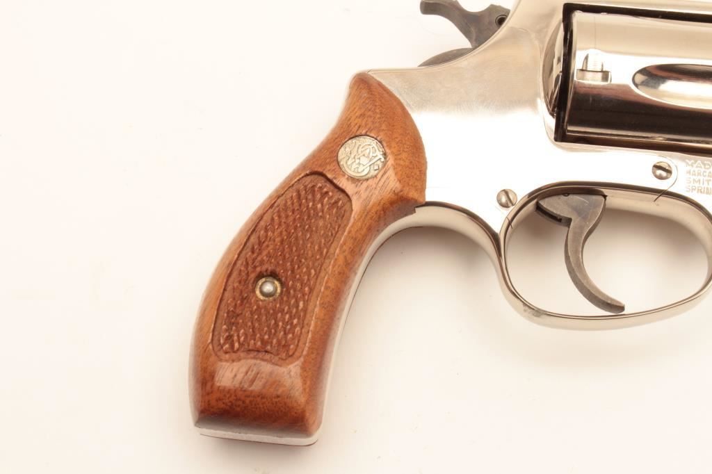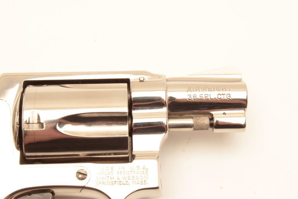 Smith & Wesson Model 37 (no dash) Airweight DA revolver, .38 Special caliber, 2” barrel, nickel finish, checkered wood medallion grips, S/N J830892; near new condition with factory two piece silver and blue cardboard box. (Modern/NO CAL. SALE). Est.: $500-$1,000.