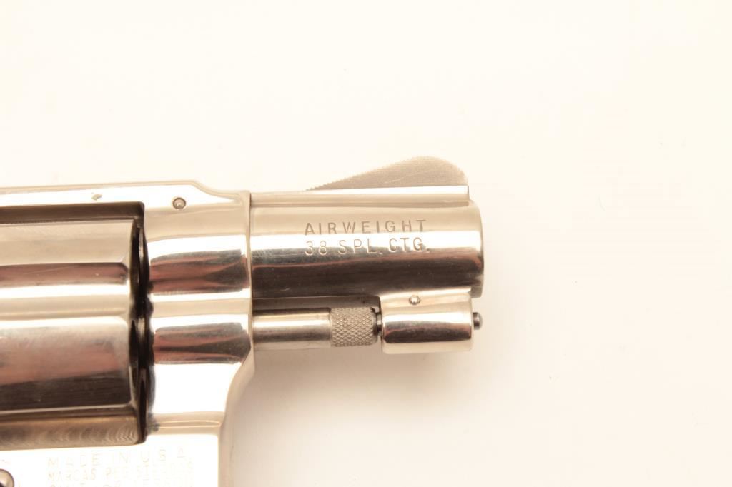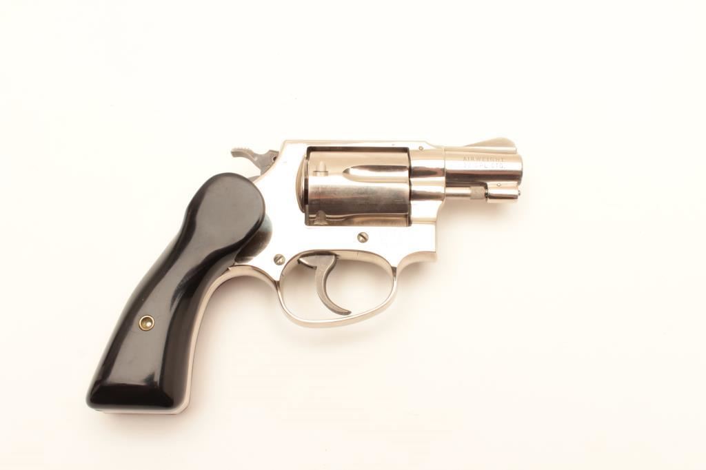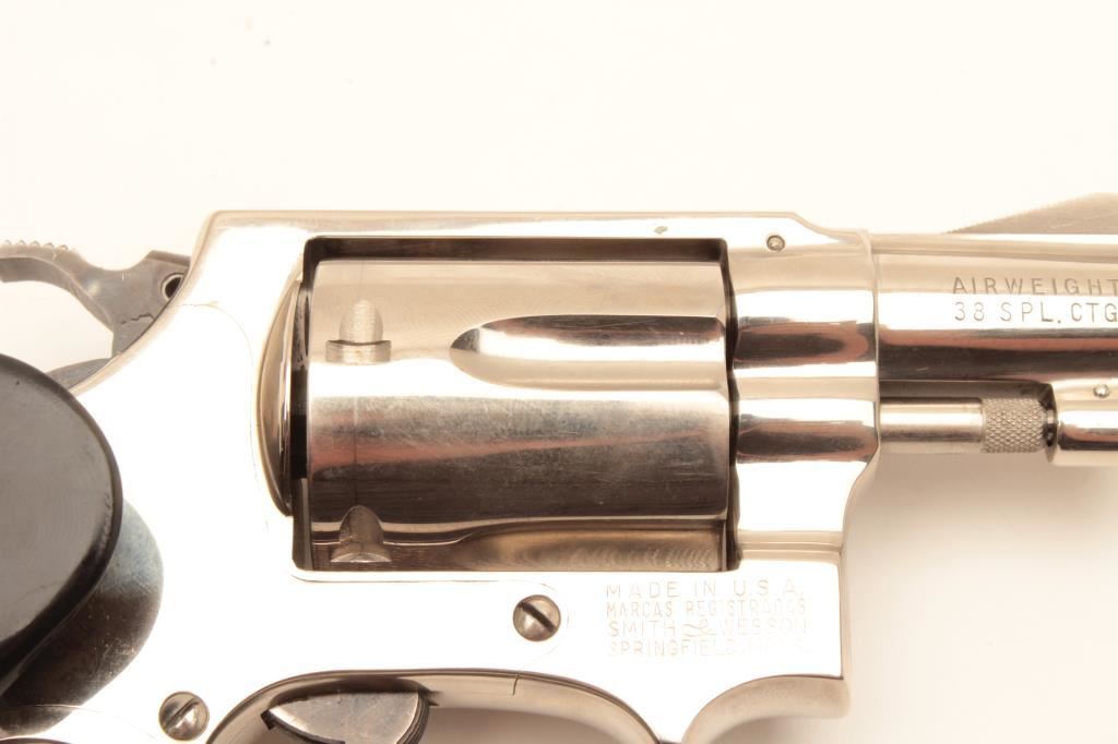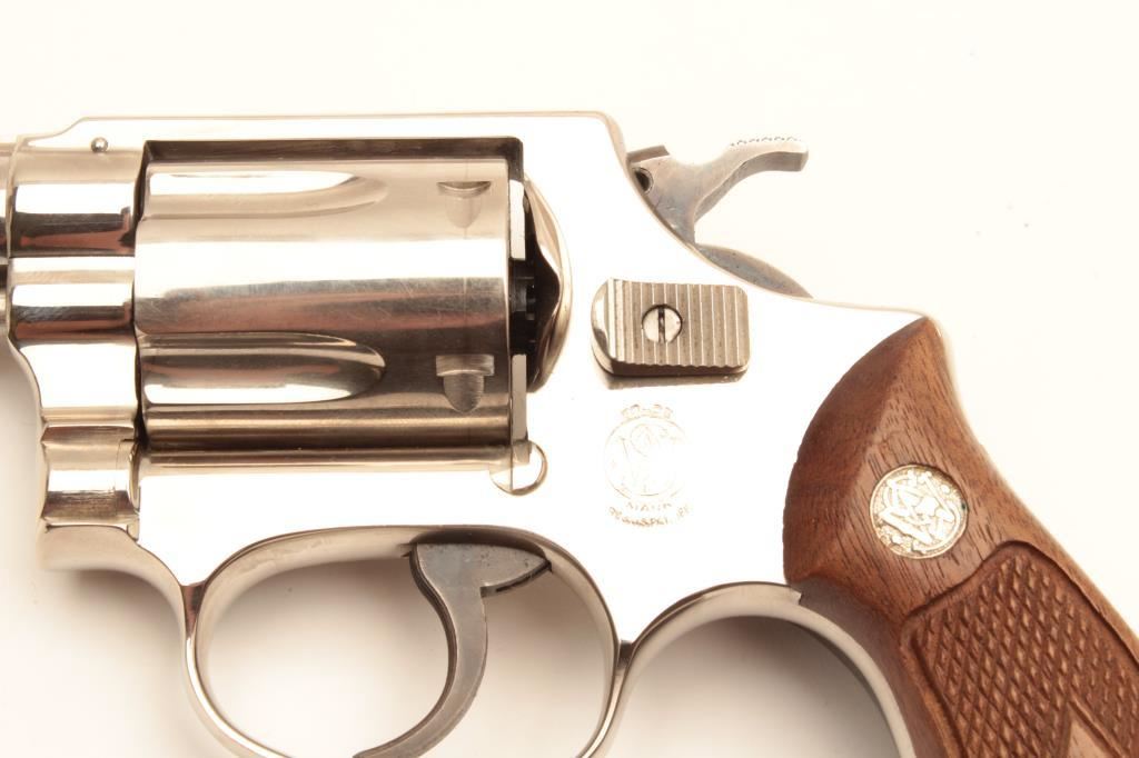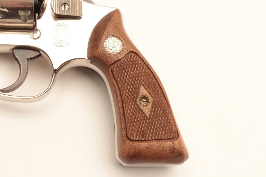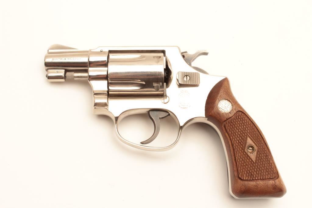 Smith & Wesson Model 37 (no dash) DA revolver, flat latch, .38 Special caliber, 2” barrel, nickel finish, left grip is checkered wood medallion, right grip is smooth black plastic, S/N 290098; overall excellent condition with factory sliver and blued two piece cardboard box. (C&R/NO PPT). Est.: $500-$1,000.