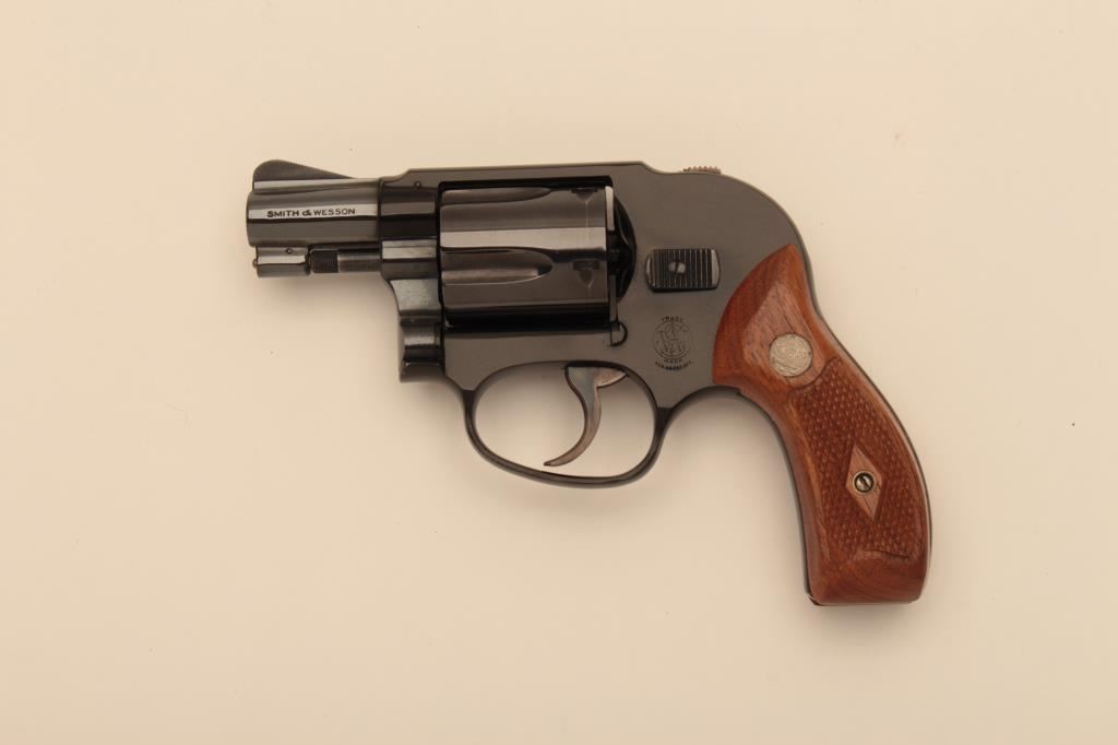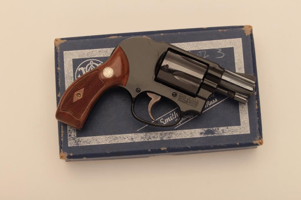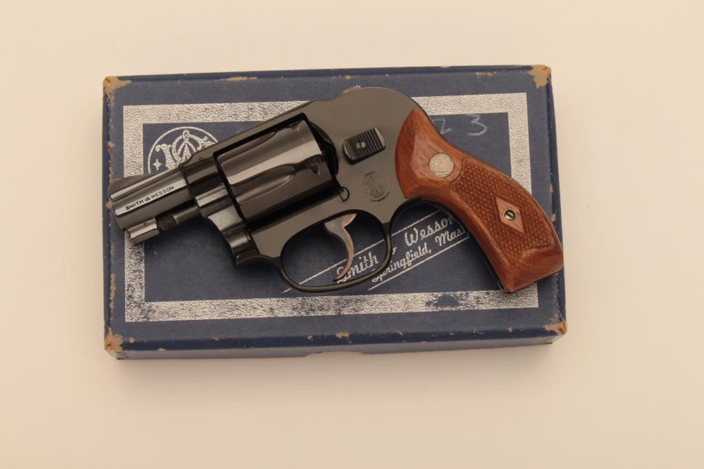 Smith & Wesson pre-Model 38 Body Guard Airweight DA revolver, .38 Special caliber, 2” barrel, blued finish, checkered wood medallion grips, S/N 90119; like new condition with factory two piece cardboard box. (C&R/NO PPT). Est.: $400-$800.