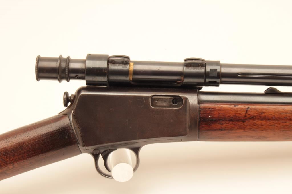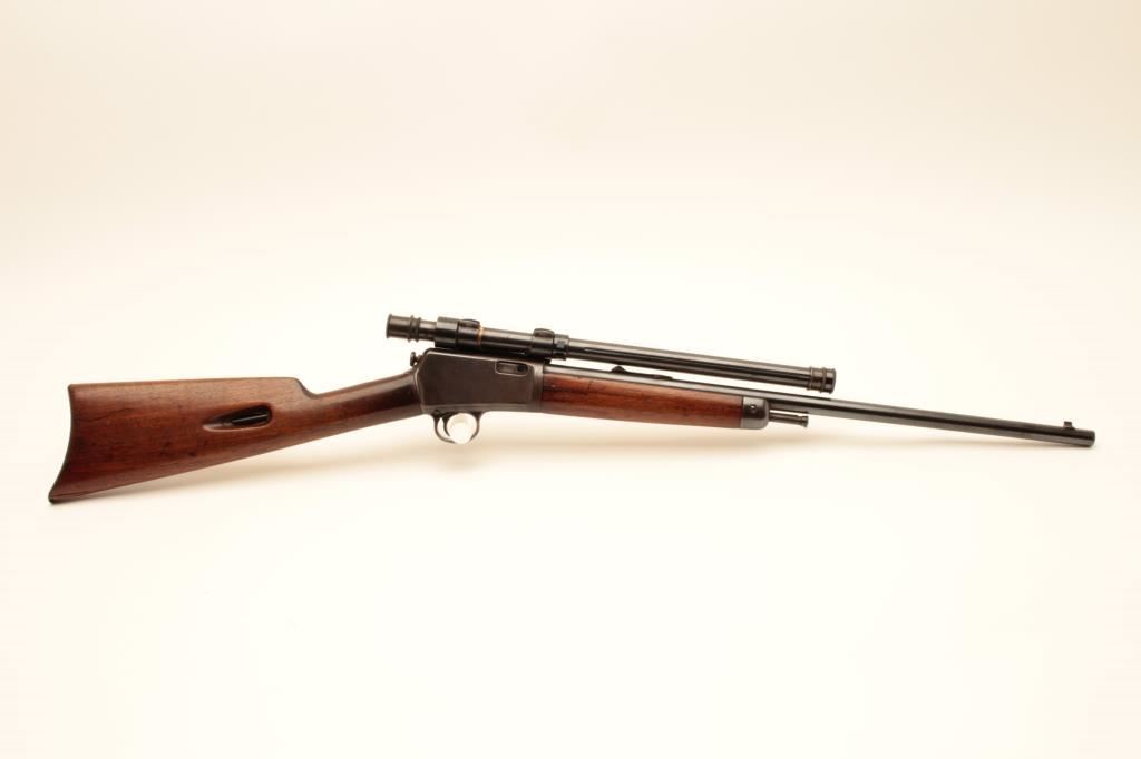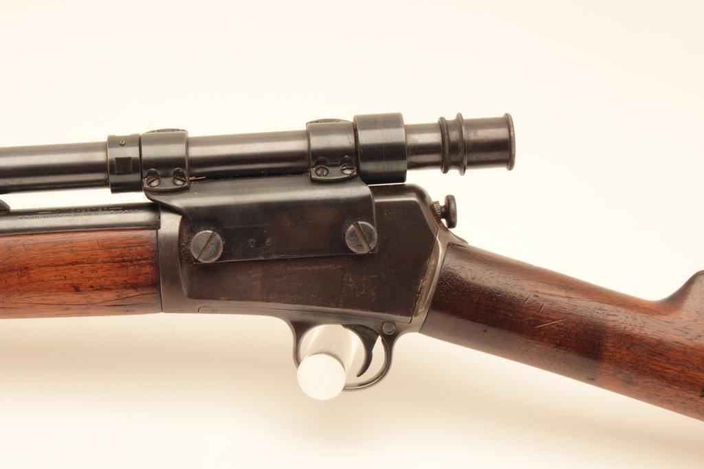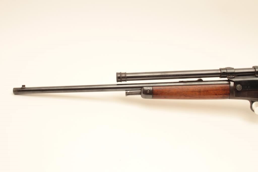 Winchester Model 03 semi-automatic rifle, .22 auto caliber, 20” barrel, blued finish, wood stocks, S/N 33687; mounted with a Winchester A5 scope displaying good optics; overall very good condition with majority of blued finish remaining, crisp action, very good markings, dark bore; wood stocks are overall good to very good. (C&R/NO PPT). Est.: $350-$700.