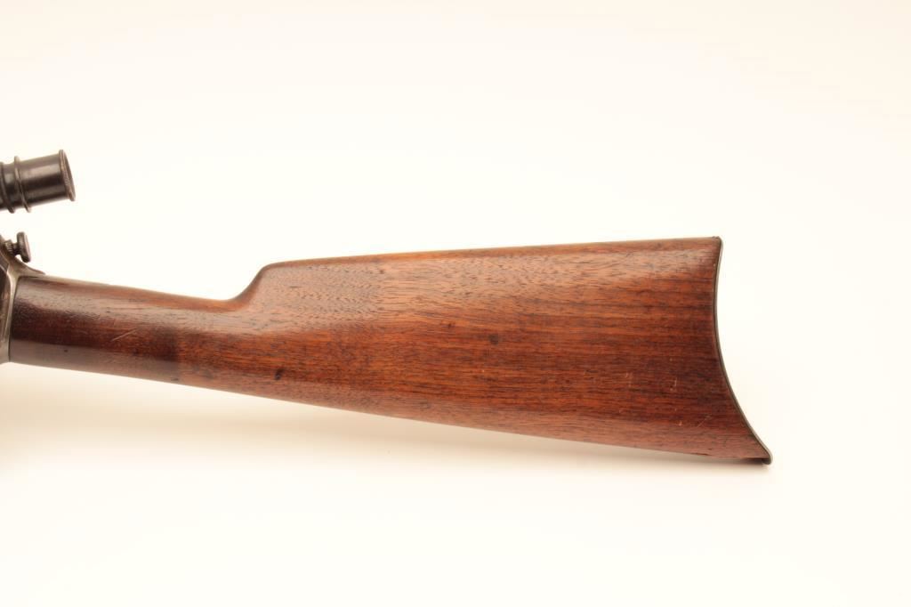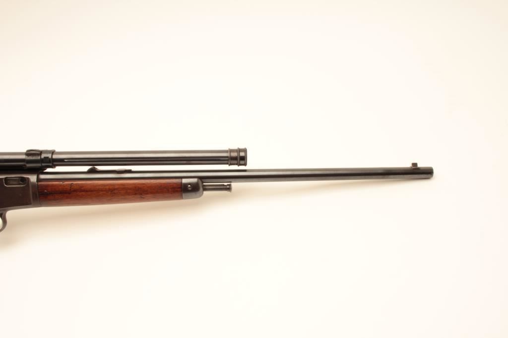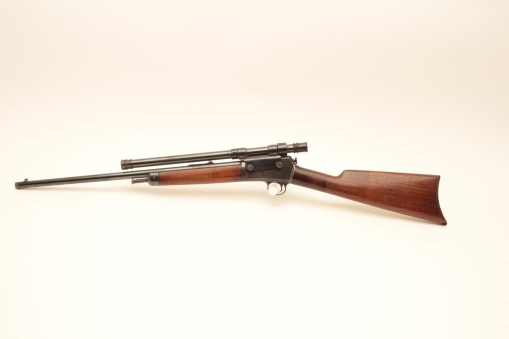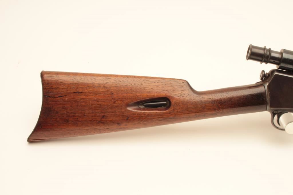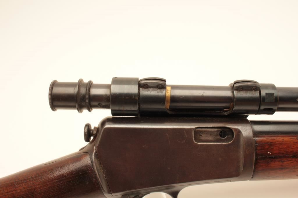 Winchester Model 03 semi-automatic rifle, .22 auto caliber, 20” barrel, blued finish, wood stocks, S/N 33687; mounted with a Winchester A5 scope displaying good optics; overall very good condition with majority of blued finish remaining, crisp action, very good markings, dark bore; wood stocks are overall good to very good. (C&R/NO PPT). Est.: $350-$700.