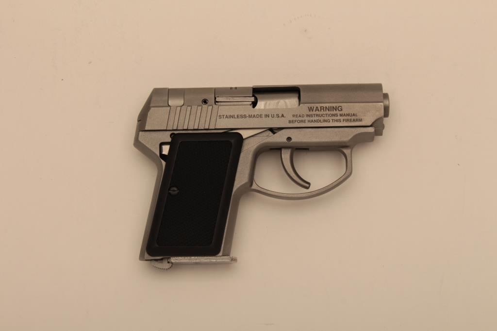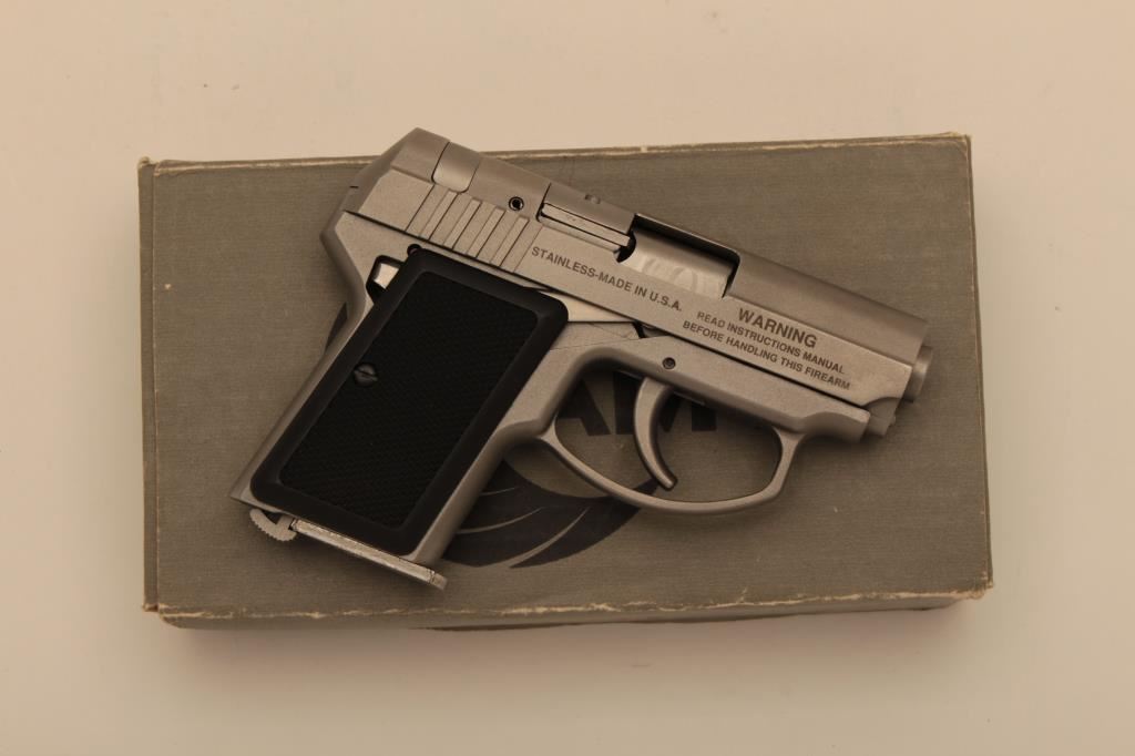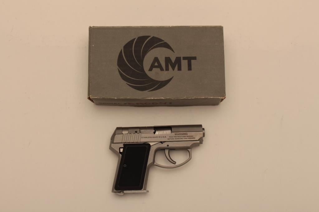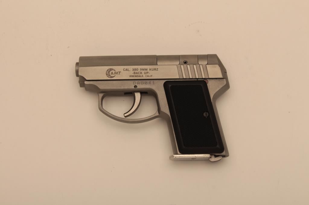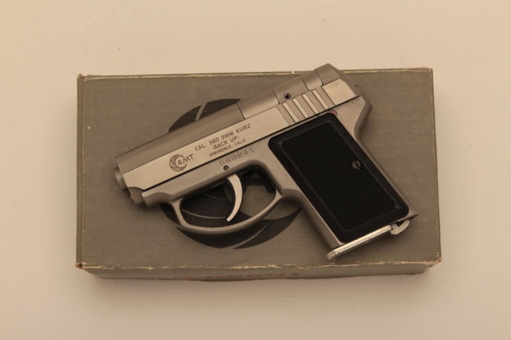 AMT (Irwindale, CA.) Back-UP Model semi-automatic pistol, 9mm Kurz caliber, 2.75” barrel, stainless, checkered hard rubber grips, S/N DA0041; overall near new condition with factory cardboard box (Modern/NO CAL. SALE). Est.: $200-$400.