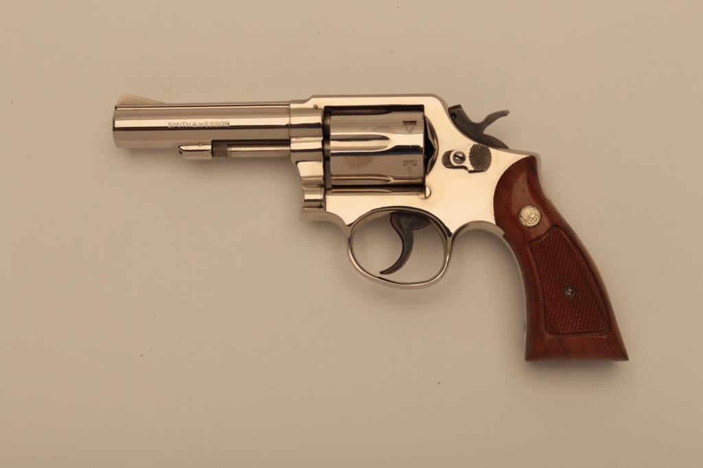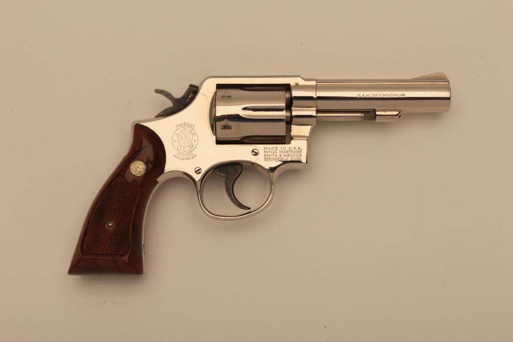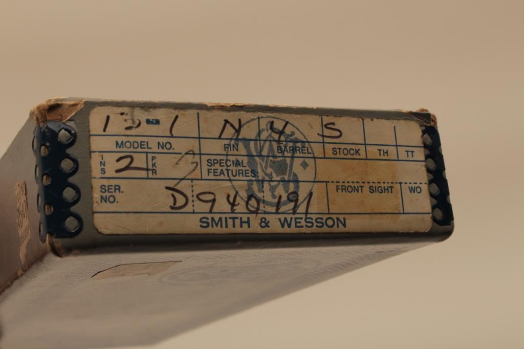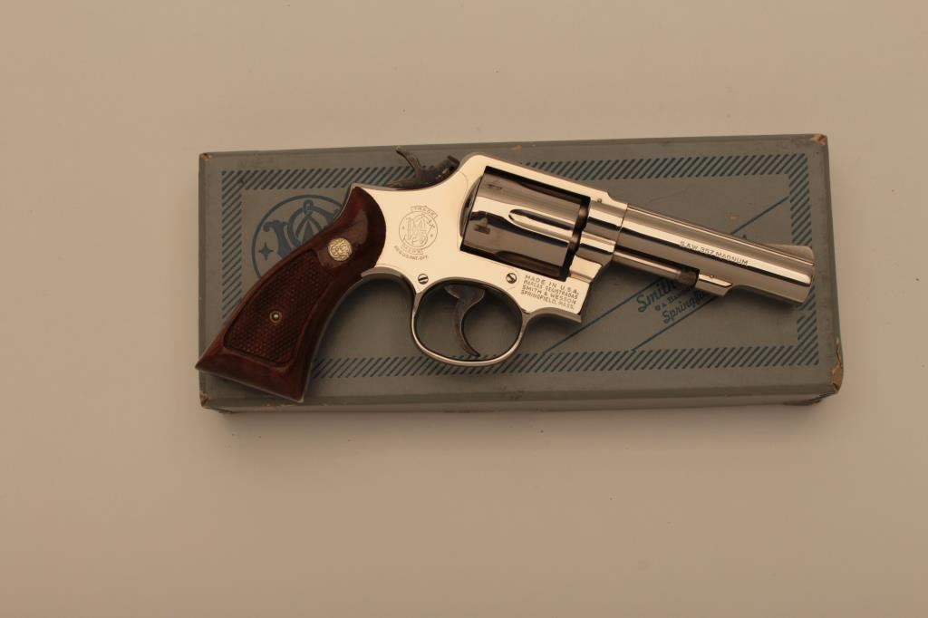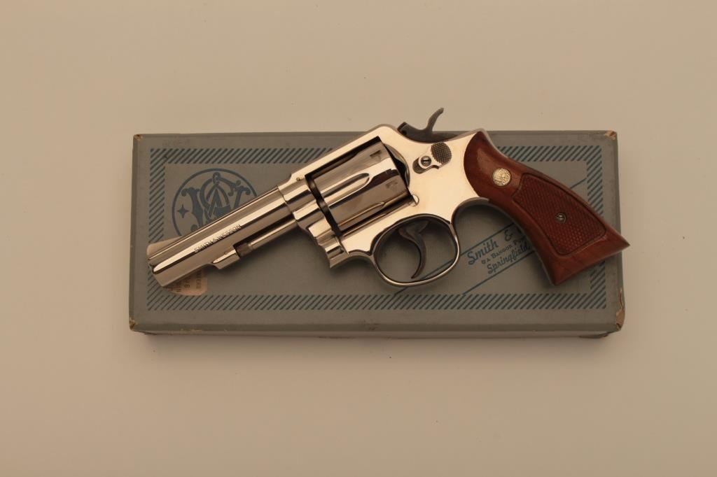 Smith & Wesson Model 13-1 DA revolver, .357 Magnum caliber, 4” barrel, nickel finish, checkered wood medallion grips, S/N D940191; overall like new condition with factory two piece silver and blued cardboard box and end label numbered to this gun. (Modern/NO CAL. SALE). Est.: $400-$800.