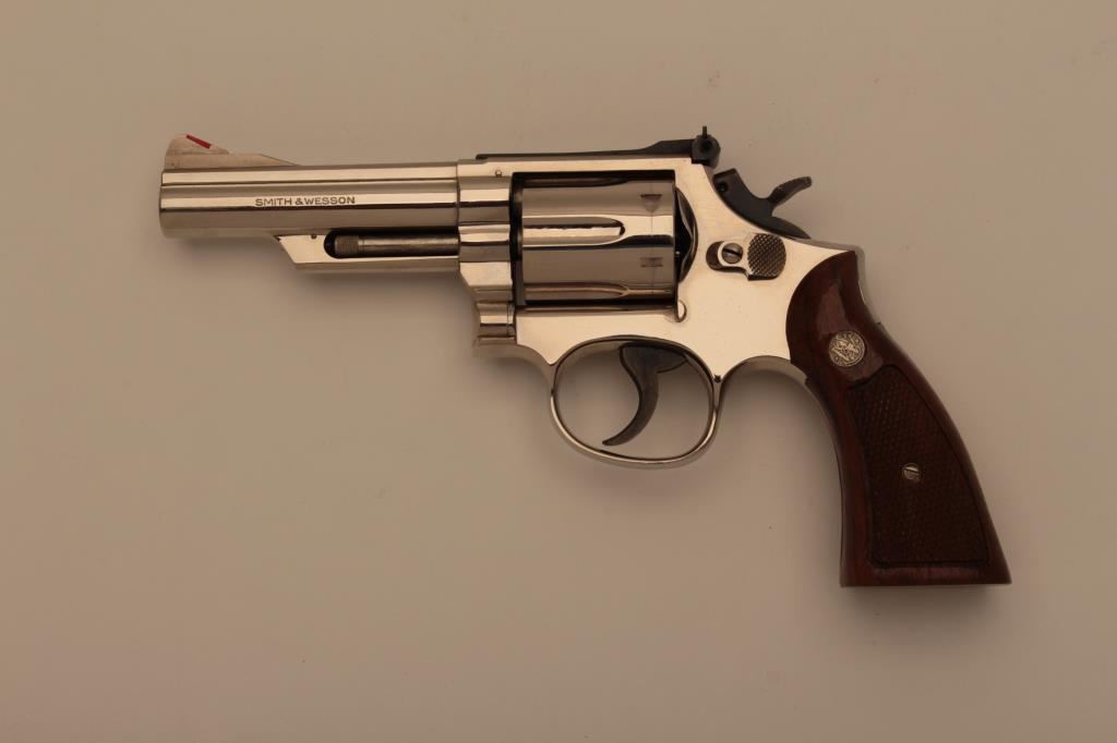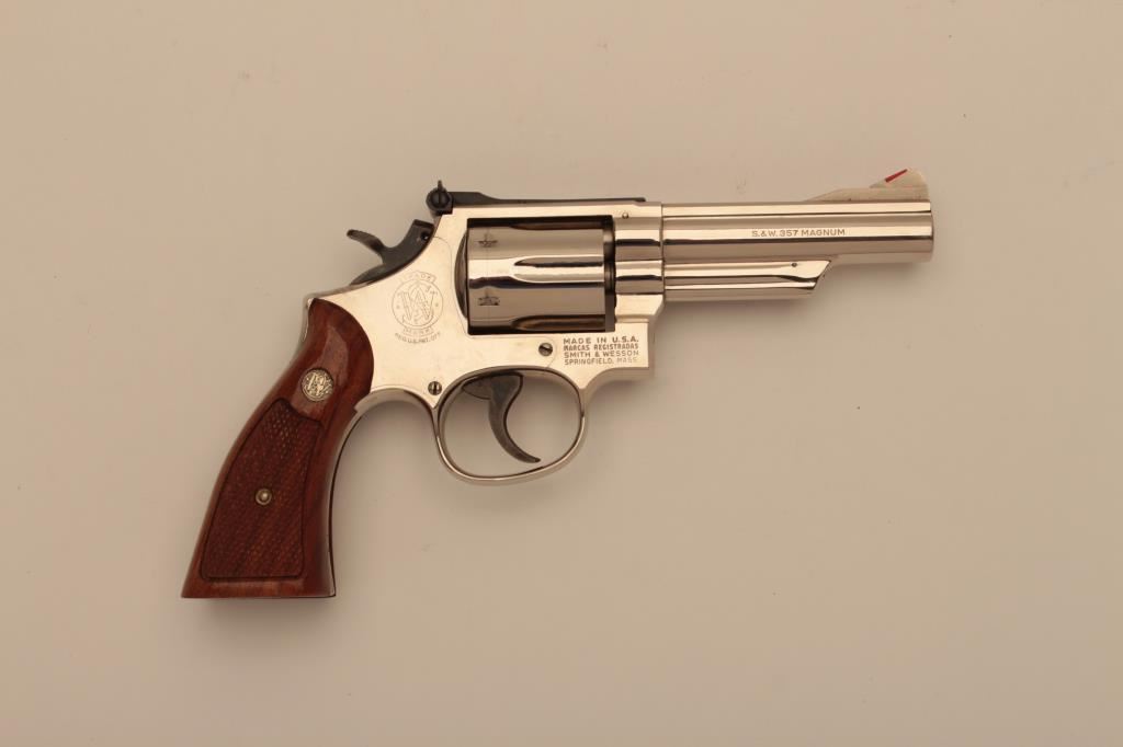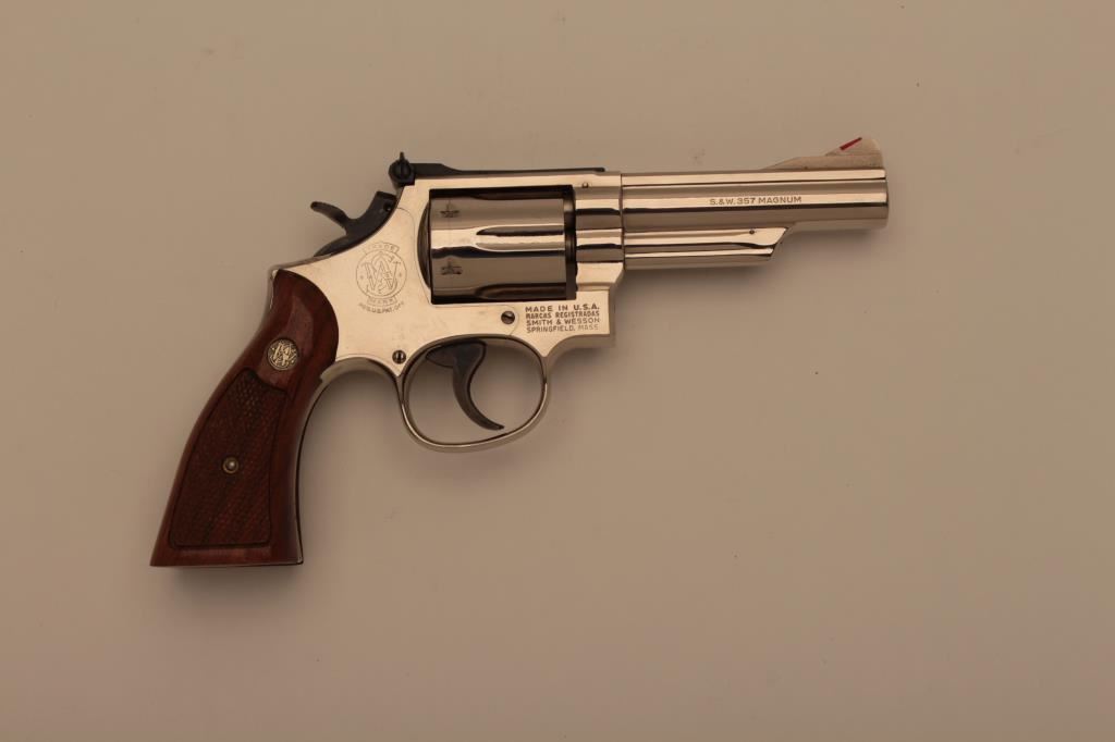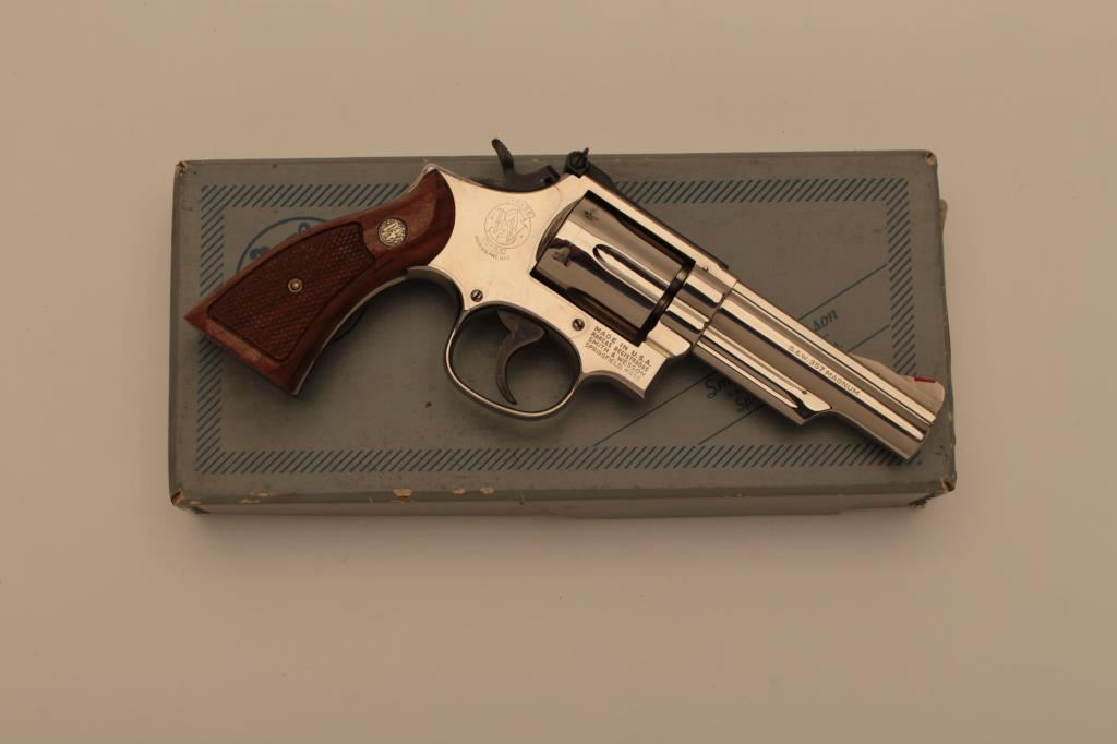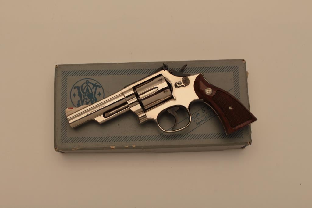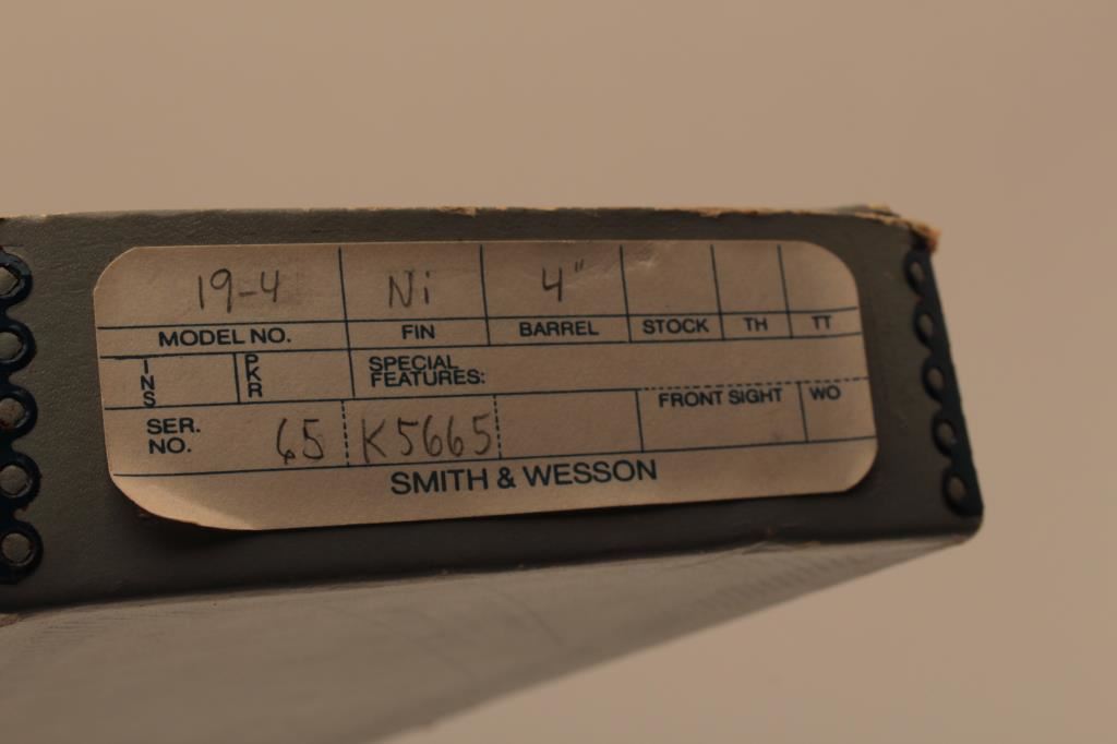 Smith & Wesson Model 19-4 DA revolver, .357 Magnum caliber, 4” barrel, nickel finish, checkered wood medallion grips, S/N 65K5665; near new condition with factory two piece cardboard silver and blue box (Modern/NO CAL. SALE). Est.: $500-$1,000.