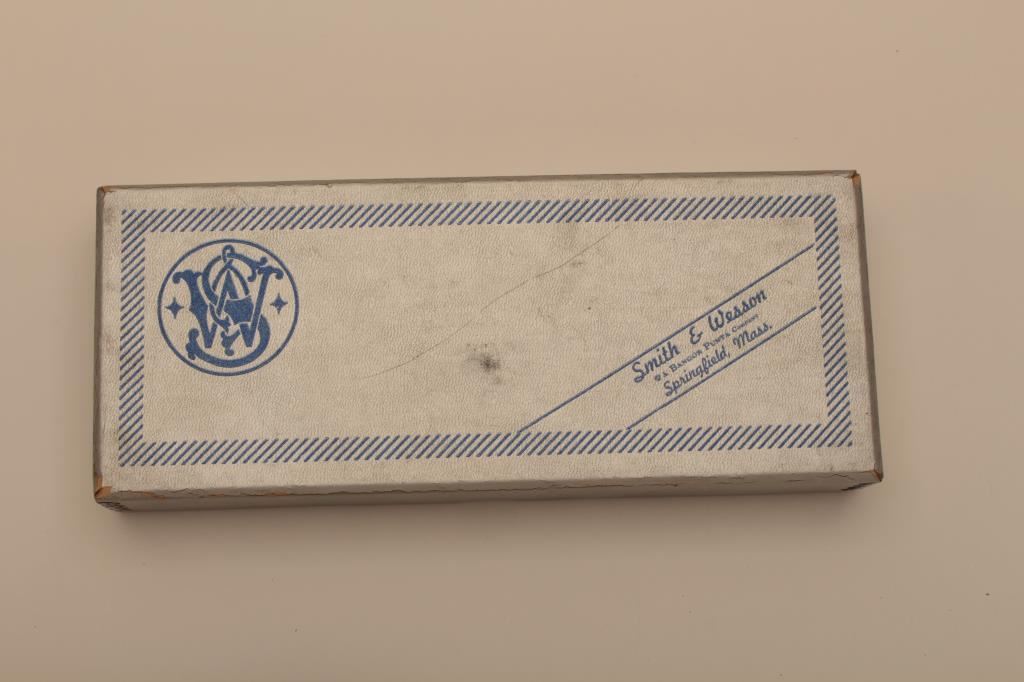 Smith & Wesson Model 15-3 DA revolver, .38 Special caliber, 4” barrel, nickel finish, checkered wood medallion grips, S/N 5K84468; near new condition with factory two piece silver and blue cardboard box and cleaning tool. (Modern/NO CAL. SALE). Est.: $400-$800.