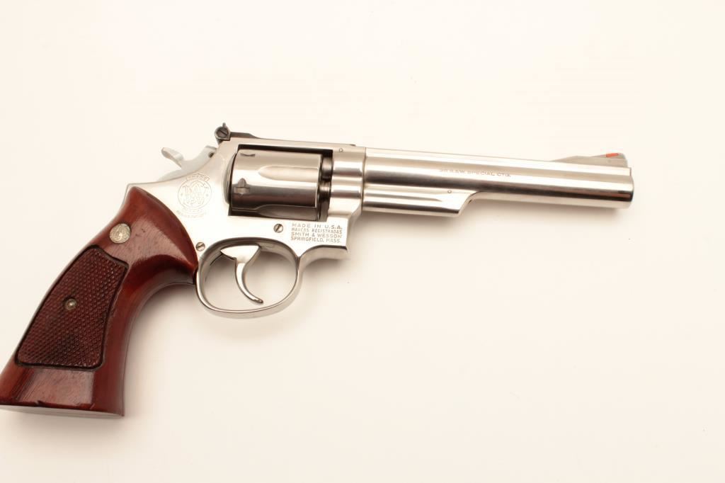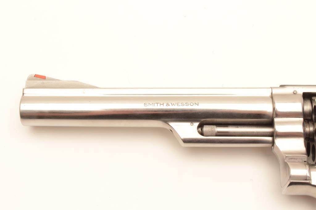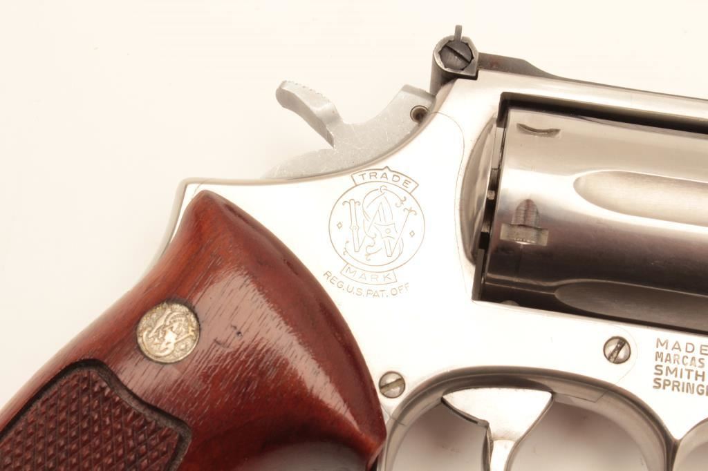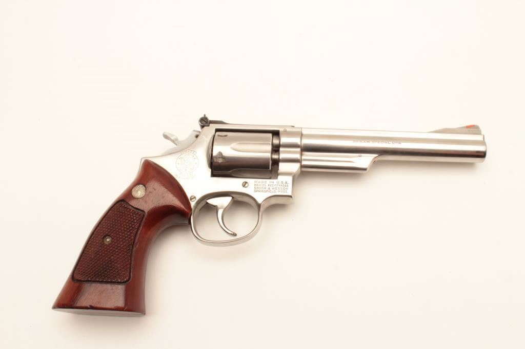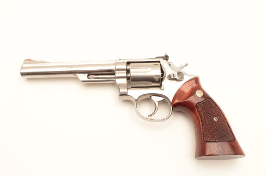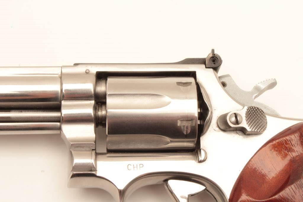 Smith & Wesson Model 68 (no dash) DA revolver, “CHP”-marked on left side of frame above trigger, .38 Special caliber, 6” barrel, stainless, checkered wood medallion combat grips, S/N 12K1159; like new condition in factory two piece cardboard box. (Modern/NO CAL. SALE). Est.: $500-$1,000.