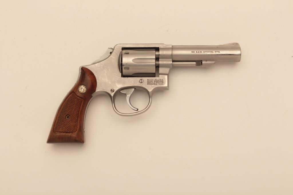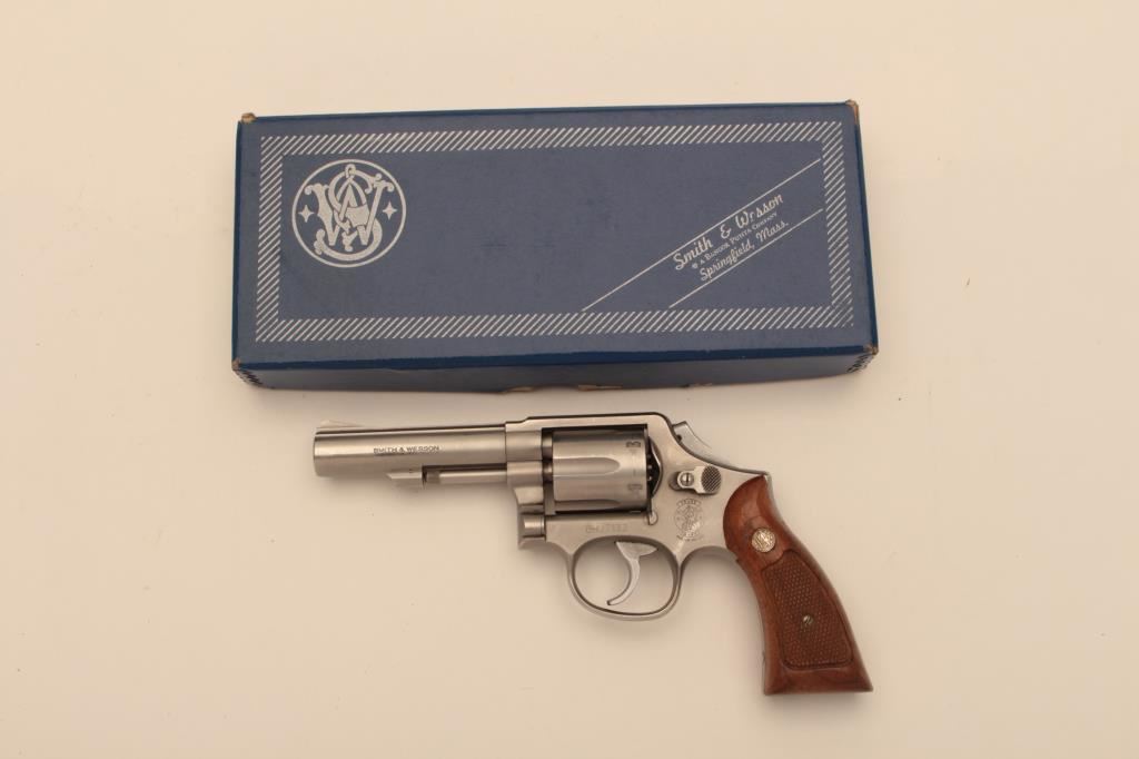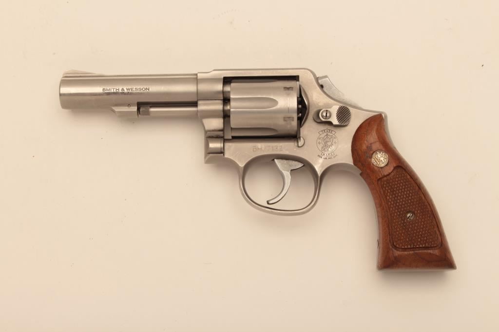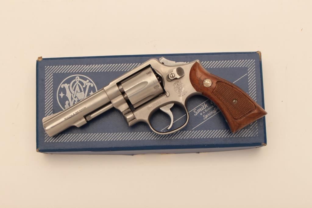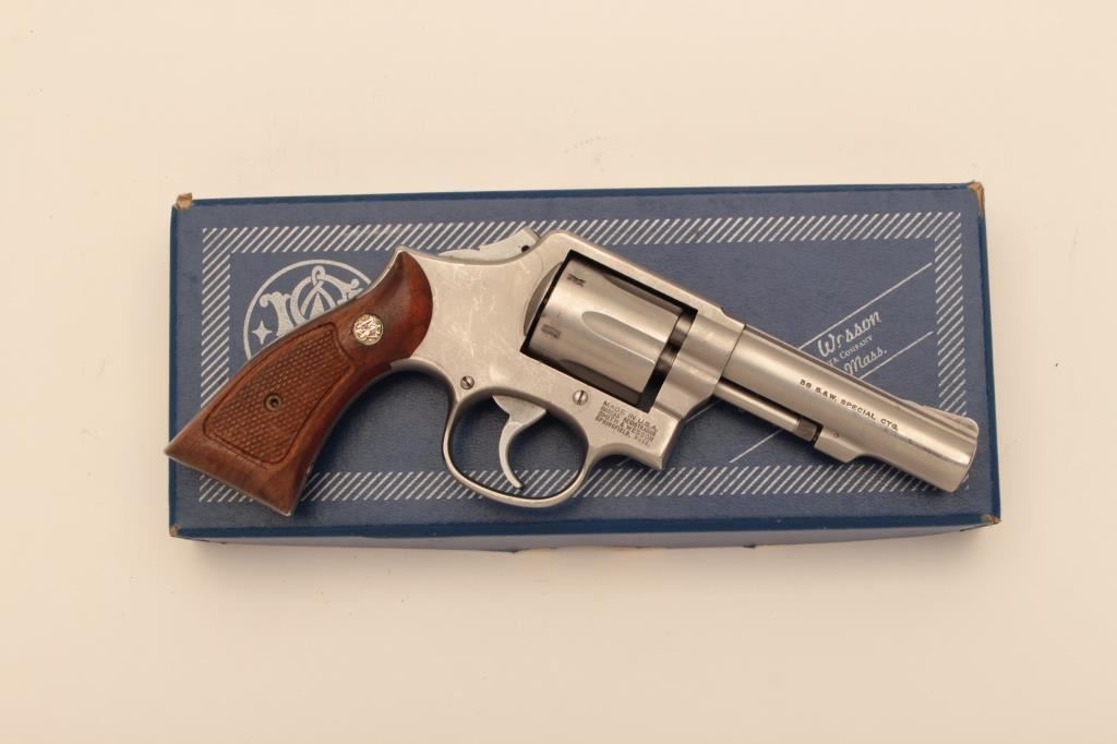 Smith & Wesson Model 64 DA only revolver, .38 Special caliber, 4” heavy barrel, stainless, checkered wood medallion grips, S/N BHJ7132, inside crane is stamped NY-1 (NYPD?); overall fine to excellent condition showing some handling but a little firing; bobbed hammer; accompanied by factory two piece cardboard box. Should be lettered re: interesting marking inside crane. (Modern/NO CAL. SALE). Est.: $500-$1,000.