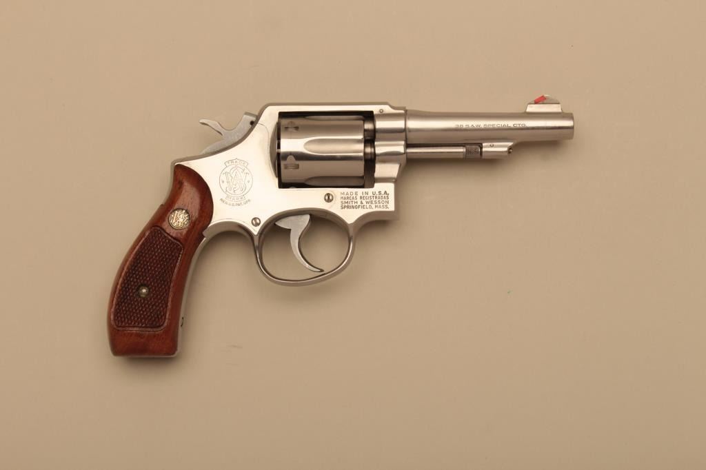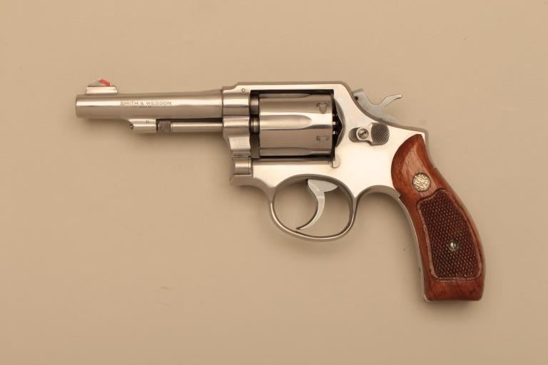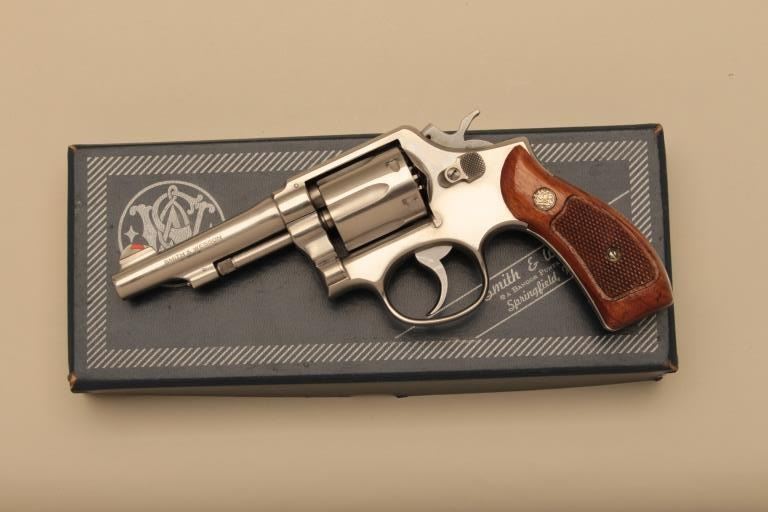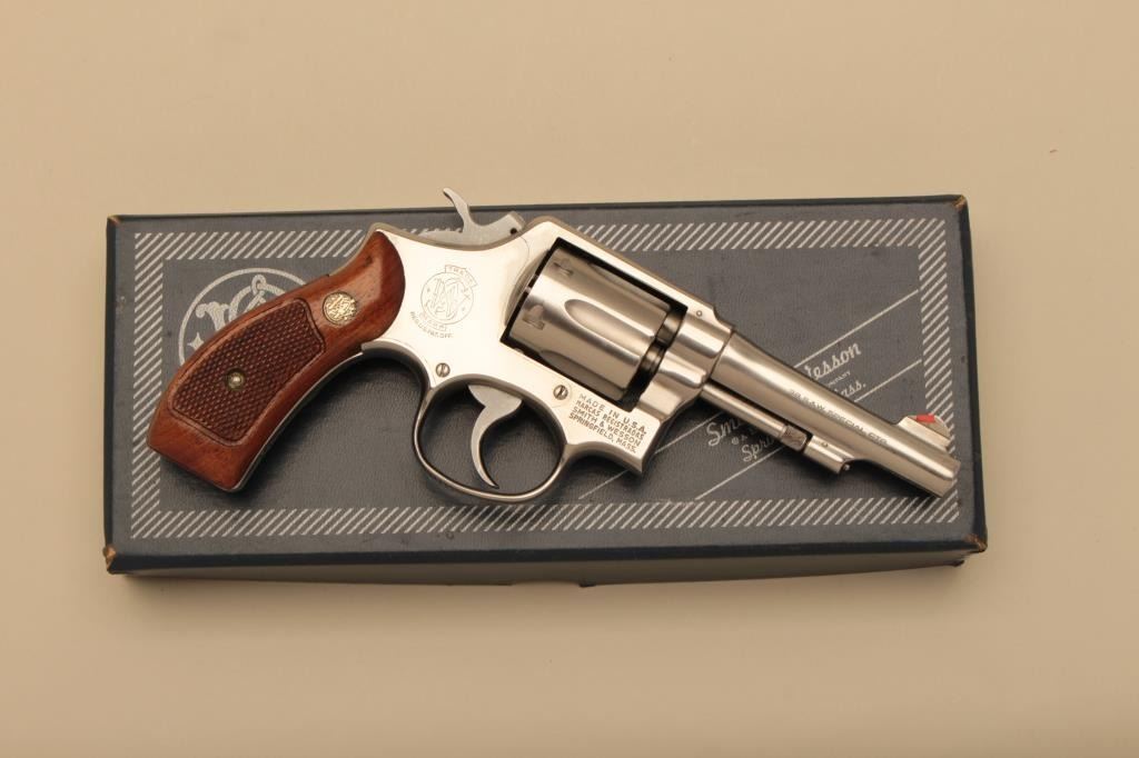 Smith & Wesson Model 64 (no dash) DA revolver, .38 Special, 4” barrel, stainless, checkered wood medallion grips, S/N D796842; near new condition with factory two piece cardboard box. (Modern/NO CAL. SALE). Est.: $600-$1,200.