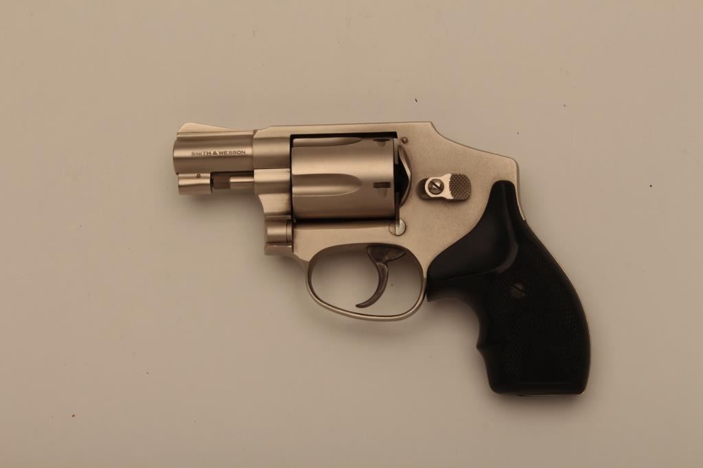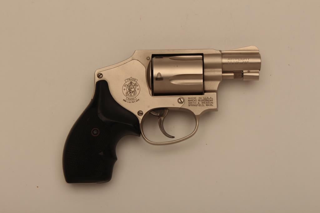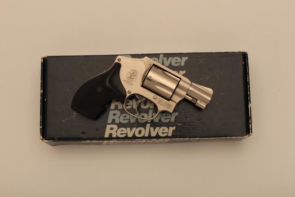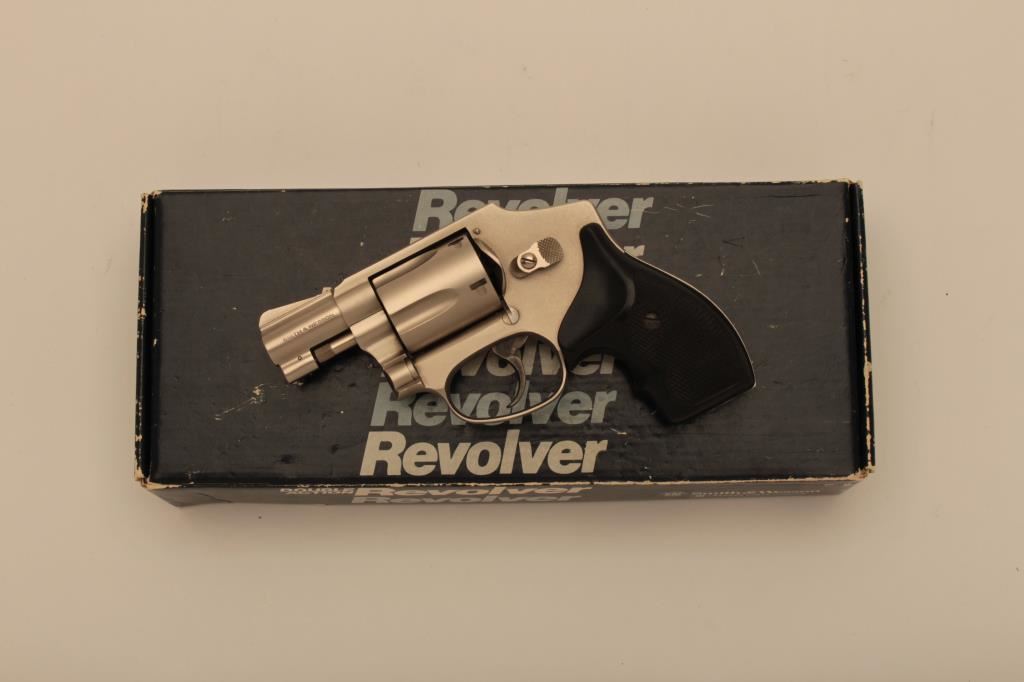 Smith & Wesson Model 442 DA Airweight hammerless revolver, .38 Special caliber, 2” barrel, satin finish, checkered hard rubber grips, S/N 8PF3767; overall fine condition with a fine bore, crisp action, sharp markings and fine grips; accompanied by a factory blue cardboard box. (Modern/NO CAL. SALE). Est.: $400-$800.