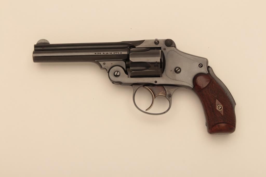 Smith & Wesson 38 New Departure top beak DA revolver, .38 S&W caliber, 4” barrel, blued finish, checkered wood grips, S/N 250343; overall fine condition with majority of original finish, fine bore, crisp action, sharp markings and fine wood grips. (C&R/NO PPT). Est.: $300-$600.