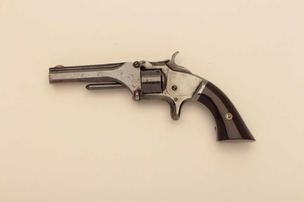 Smith & Wesson Model 1 Second Issue spur trigger revolver, .22 short RF caliber, 3.25” barrel, blued finish to barrel and cylinder with silver wash on brass frame; S/N 82972; overall fine condition showing majority of original blued and original silver wash finishes (some flaking of finish to right side of barrel assembly) ; crisp action and markings, fine grips; bore is overall good with some light spots of erosion; barrel hinge is tight; a really nice untouched Model 1 Second Issue. (Antique). Est.: $350-$700.