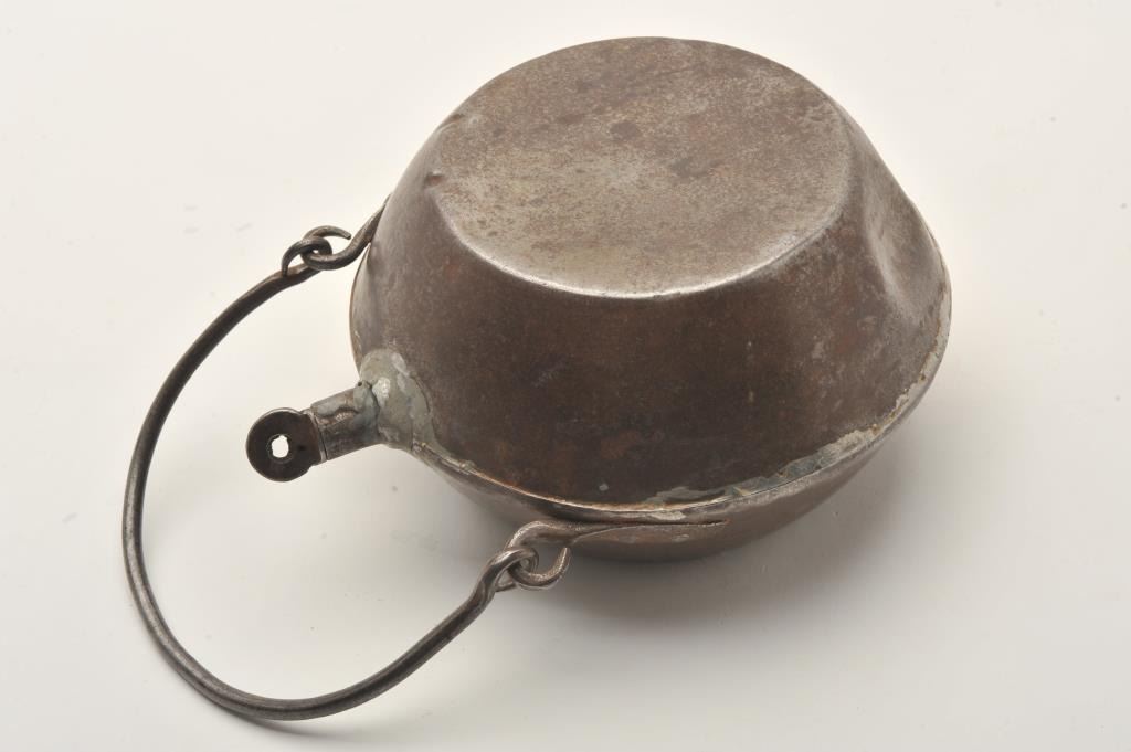 Large antique iron canteen, approximately 9” diameter and 5” in depth with iron handle; spout has been repaired; possible for use in a wagon as somewhat large for a person or soldier to carry. Est.: $250-$500.