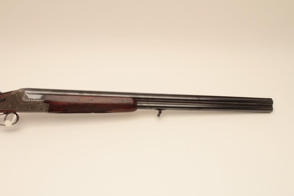 Gebr Merkel Suhl Germany (BDR) 12GA Over/Under shotgun with extra high grade with hand detachable side plates, double triggers, auto ejectors, 28” barrel with low rise non vent rib, select checkered pistolgrip stock, monte carlo cheek piece, European size sling swivels, S/N 91162. Elaborately and profusely scroll engraved. Measures 14 ½” to the end of factory butt plate. The gun remains in excellent condition with verylittle use and is near mint. 98%-99% overall with excellent bores. The stocks also are excellent with crisp checkering. A European leather case is included. Obtained by an American G.I. in European theater before wall came down and imported for own use (No Import Marks). Estimated replacement cost $10,000-$12,000+ from Merkel in this grade. (Modern) Est.: $3,500-$7,000