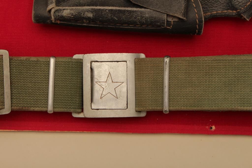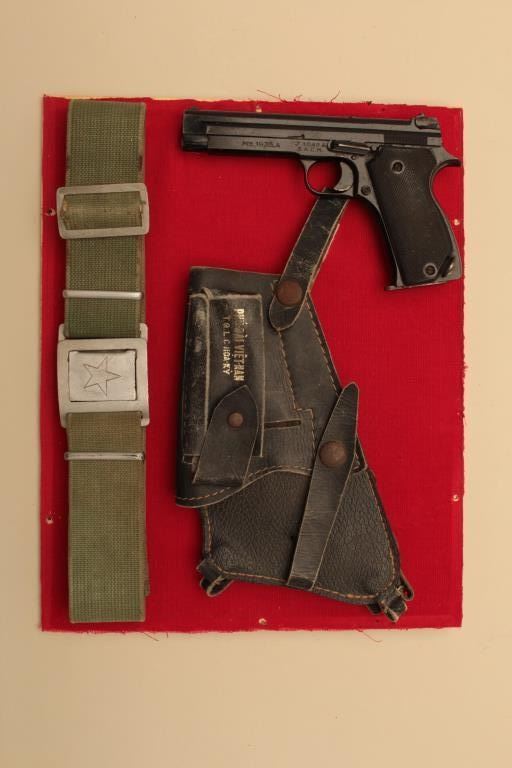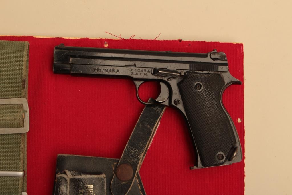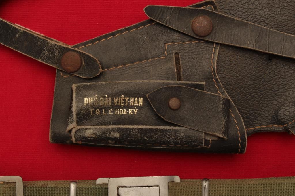 French Model 1935A Semi-Auto pistol in .32 French long caliber mounted in display case with Vietnamese holster and belt. Brought home by a Marine Corps Non-commissioned officer with no import marks. The holster ismarked in gold embossed letters, “Pho-Dai-Viet-Nam, T.O.L. C., Hoa-Ky”. The pistol is very good plus condition with most original black enamel finish. The holster is good to very good as is the belt. The rig was carried and used. Thought to be a gift from South Vietnamese officer to Marine Sargent. (C&R/PPT) Est.: $350-$700