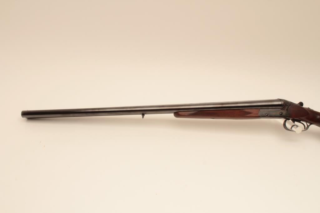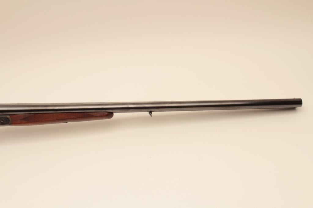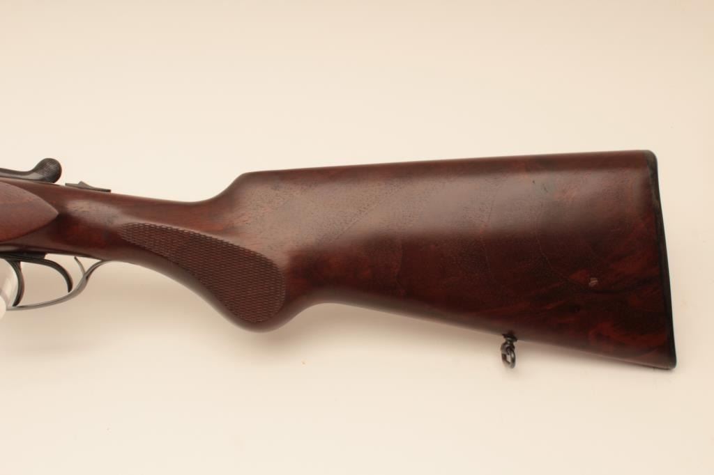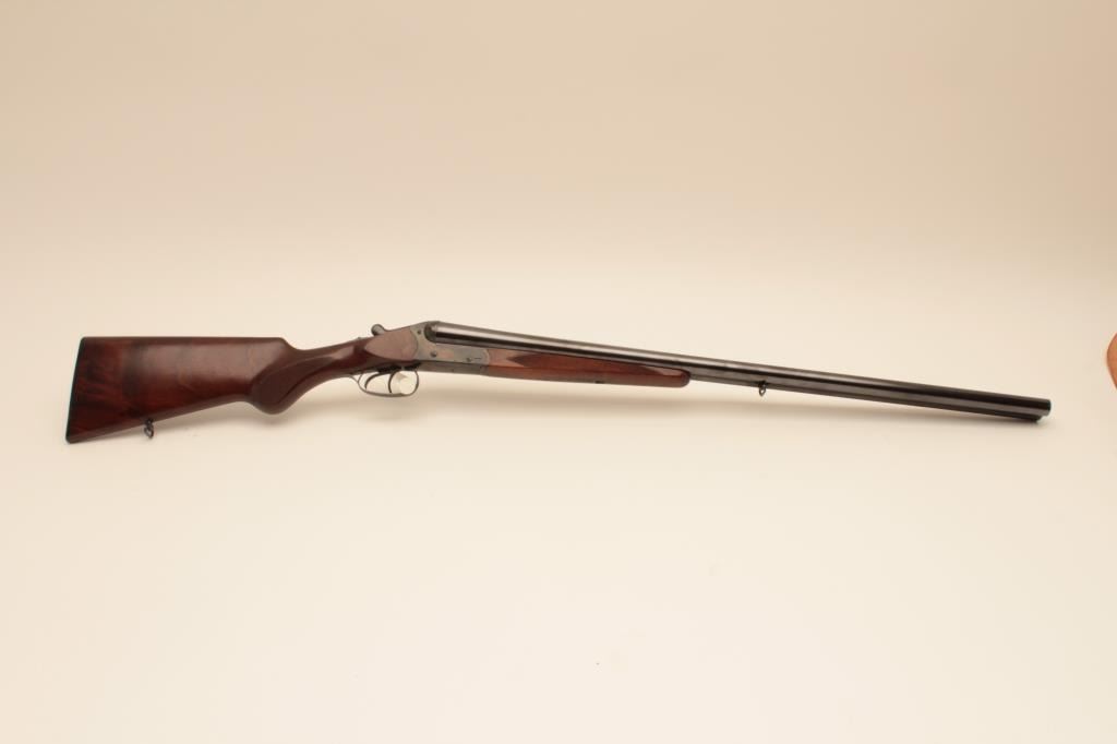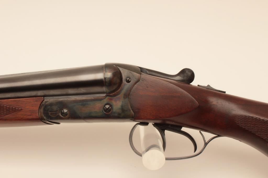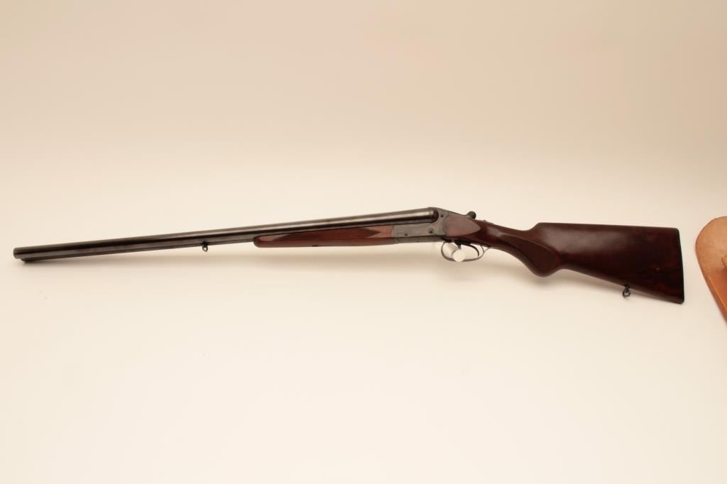 Suhl Germany Post War (GBR) guild gun in 12GA with 28” barrels choked modified right and full left, double triggers, standard extractors, rounded pistol grip European style stock with sling swivels, S/N 879716.Blue and case color finish remain in excellent condition with 98%-99% plus and colors are very brilliant. The stocks are fine to excellent. 2 ¾” chamber and shows very little to almost no use. With Europeanleather carry case. Obtained by an American G.I. in Europe before the wall came down and imported for own use. No import marks. Current replacement for comparable Suhl made gun is $2000-$2500. (Modern) Est.: $600-$1200