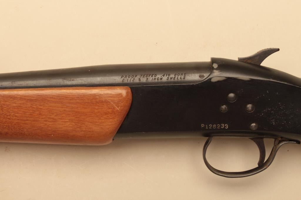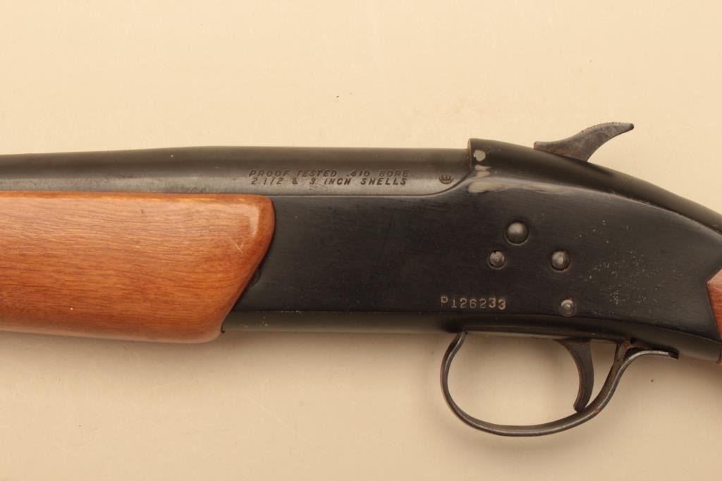 Stevens 940E, #P126233, 410 Ga., 26 1/8" barrel, exposed hammer, blued finish with smooth stocks, 14" LOP. Shotgun is in very good condition overall, good bore, good action, good stocks. (Modern) Est. $150-300