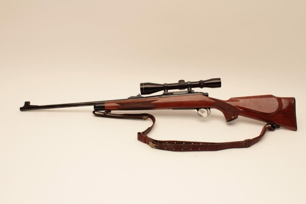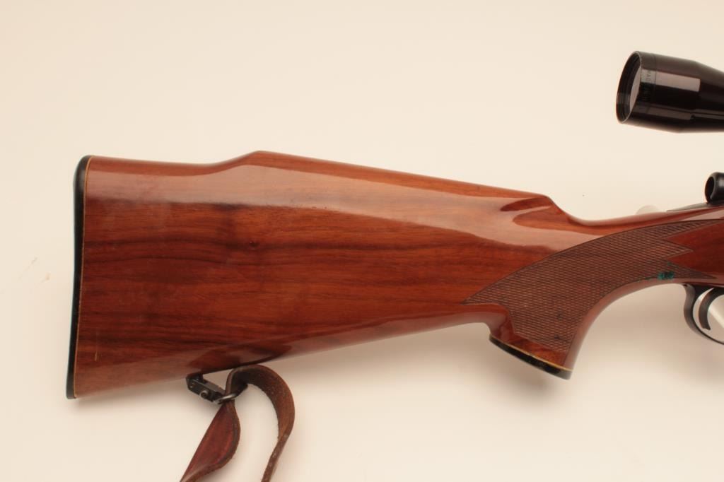 Remington 700, #6707904, .22-250 cal., 24" barrel, blue finish, checkered walnut stock, quick release sling swivels with leather Hunter sling. Rifle is in fine condition overall, bore is very good, action is good,retains approximately 95% original finish. Mounted with a Leupold Vari-X II 3-9 scope with clear optics. (Modern) Est. $350-700