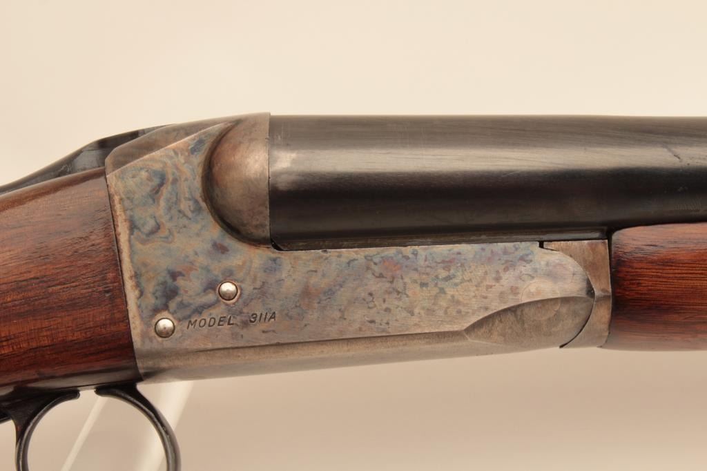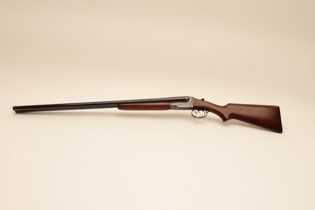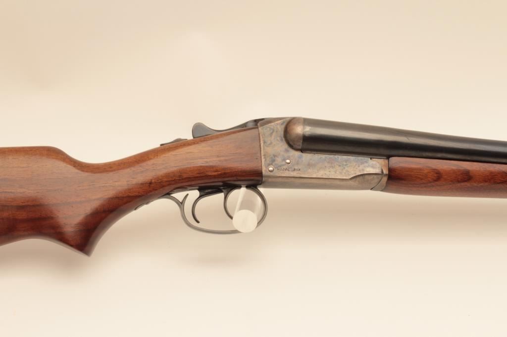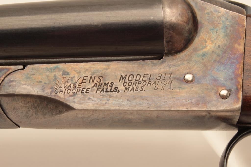 Stevens 311 12GA SxS Shotgun, NSNV with 30” barrels choked modified right and full eft. Locks tight with near fine bores. Measures 14 ¼” to the end of the plate. Very good plus to almost fine. 85%-95% blue and case colors. Wood almost fine. Est.: $150-$300