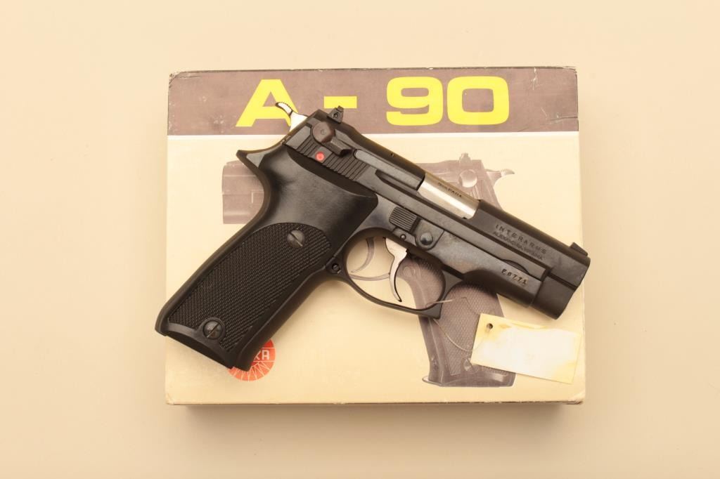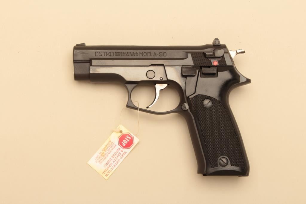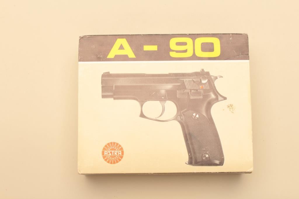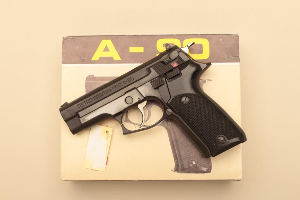 Astra Model A-90, #F6771, 9mm, 3 3/4" barrel, blued finish with checkered plastic grips. Pistol is in as new condition. Includes original box and one hi-cap mag (not transferrable to CA or other prohibitedstates or areas). (Modern/PPT) Est. $300-600