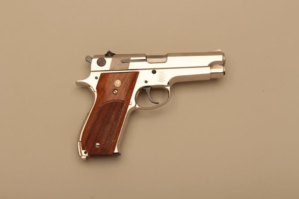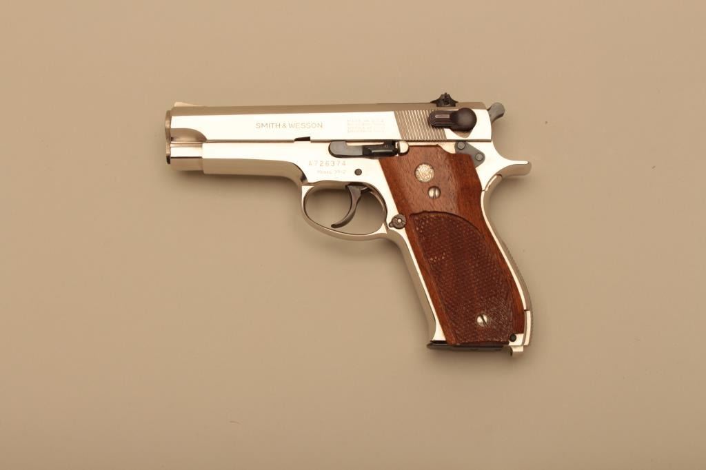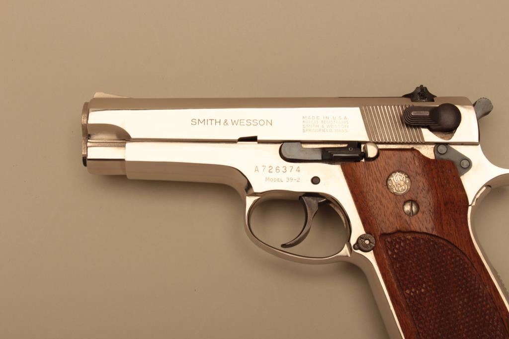Smith & Wesson Model 39-2, #A726374, 9mm, 4" barrel, nickel finish, adjustable sights, checkered medallion walnut grips. Pistol is in fine condition overall, showing 95-98% original finish, mint bore, excellent action, grips are very good but are dry, with no chips or cracks and have crisp checkering. Hard to improve upon, and deserving of a box. One mag. (C&R/PPT) Est. $300-600