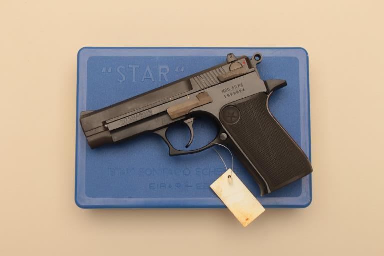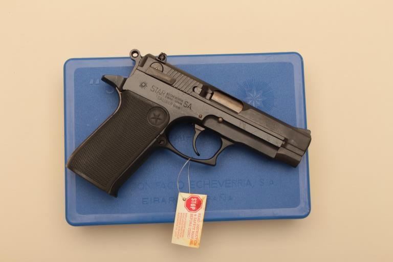 Star Model 30PK, #1699024, 9mm, 3 7/8" barrel, matte blue finish, 3 7/8" barrel, matte blue finish, adjustable sights, checkered plastic grips. Pistol is in as new condition, with the original shipping grease still all over the gun and action. Includes original box, one hi-cap mag (not transferrable to CA or other prohibited states or areas). (Modern/PPT) Est. $250-500