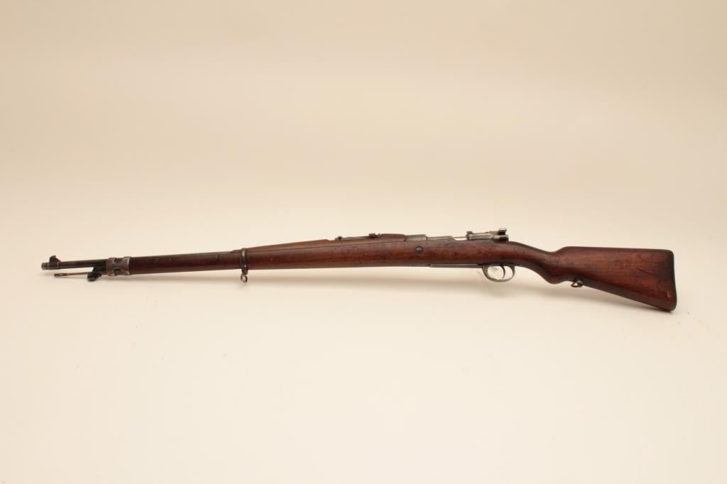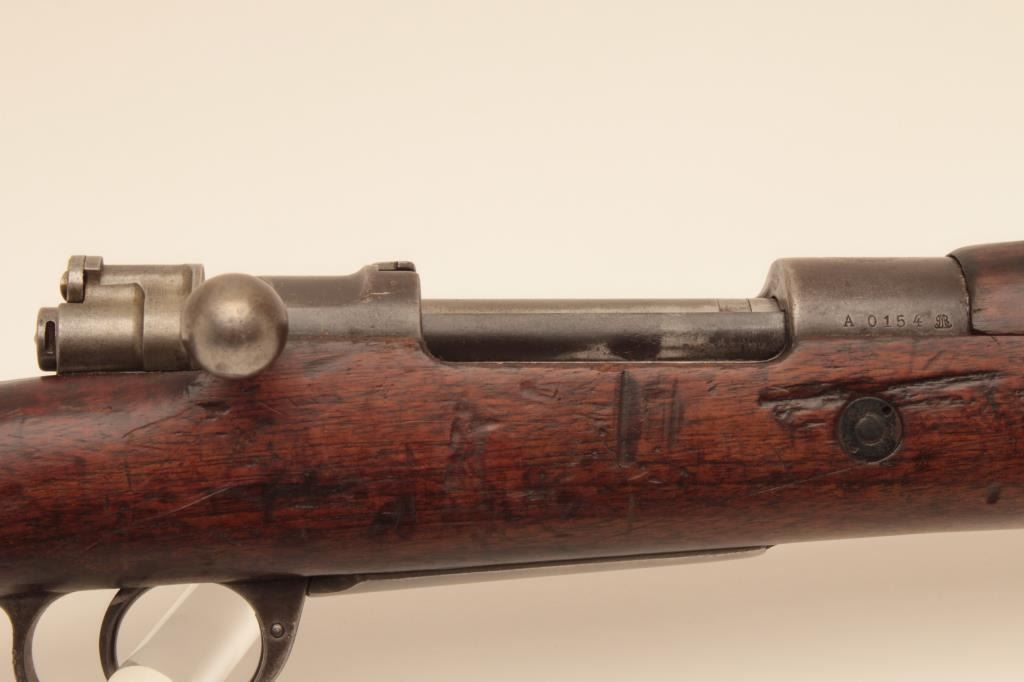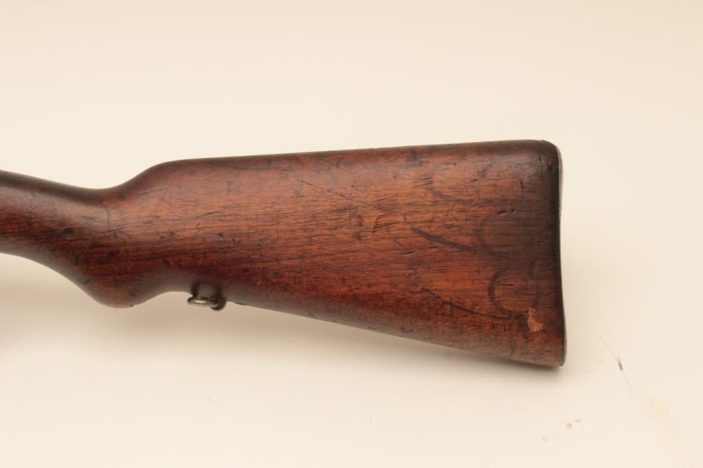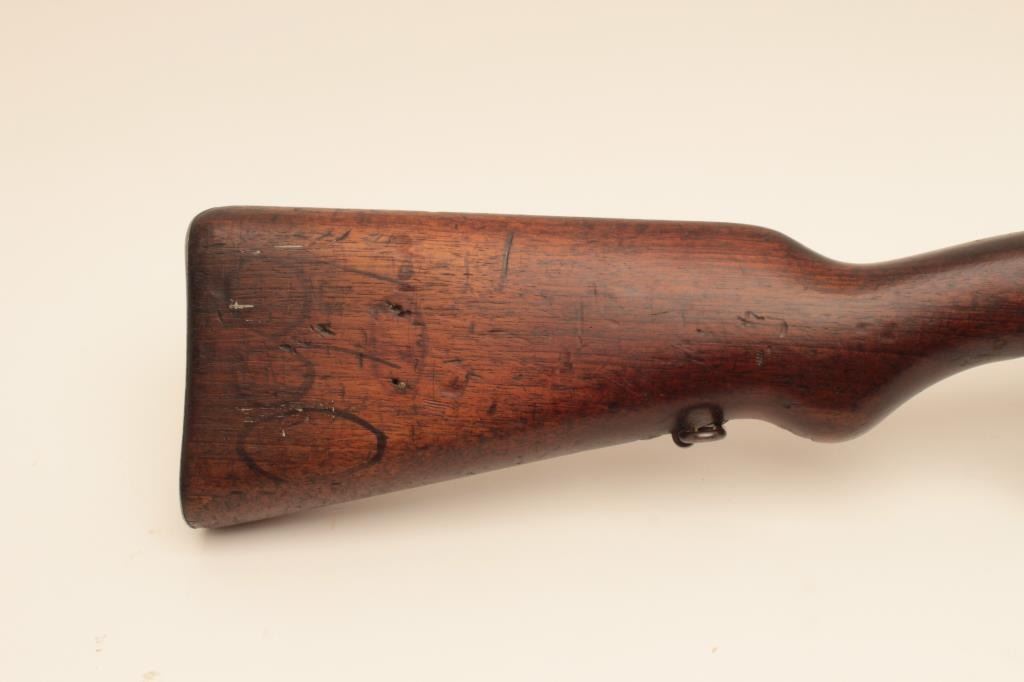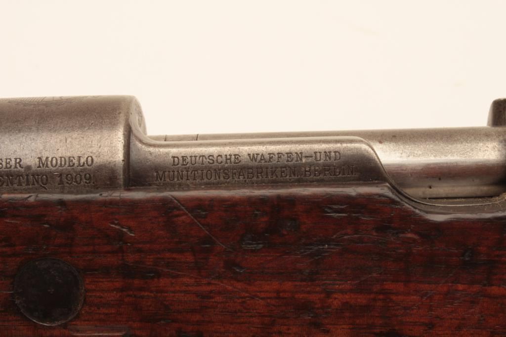 Argentine Model 1909 Mauser bolt action rifle, 7.65 caliber, Serial #A0154. The rifle is in good overall condition with a 30” import marked barrel with a ramped blade front sight and military tangent style rearsight. The metal surfaces retain a significant amount of their military finish with the Argentine crest on the front ring. The wood stock is in fair condition showing moderate wear with numerous dents and marsfrom carry and use. The number, “660” has been written on both sides of the butt stock, which ends with a smooth steel butt plate. The bore is fair, the action functions and the markings are legible. Est.: $250-$500. (C+R).