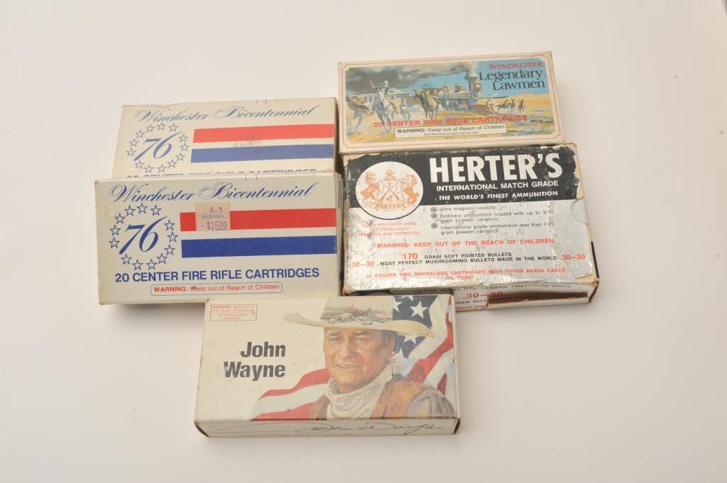 Lot of five boxes of Winchester collector’s ammunition. One box of John Wayne Winchester 32-40 cartridges. Two boxes of Winchester Bicentennial 30-30 cartridges a box of Winchester Legendary Lawmen 30-30 and a boxof Herter’s 170 grain 30-30’s. All new manufactured ammunition. The Winchester boxes are all in good condition while the Herter’s box is splitting at the seams. Est.: