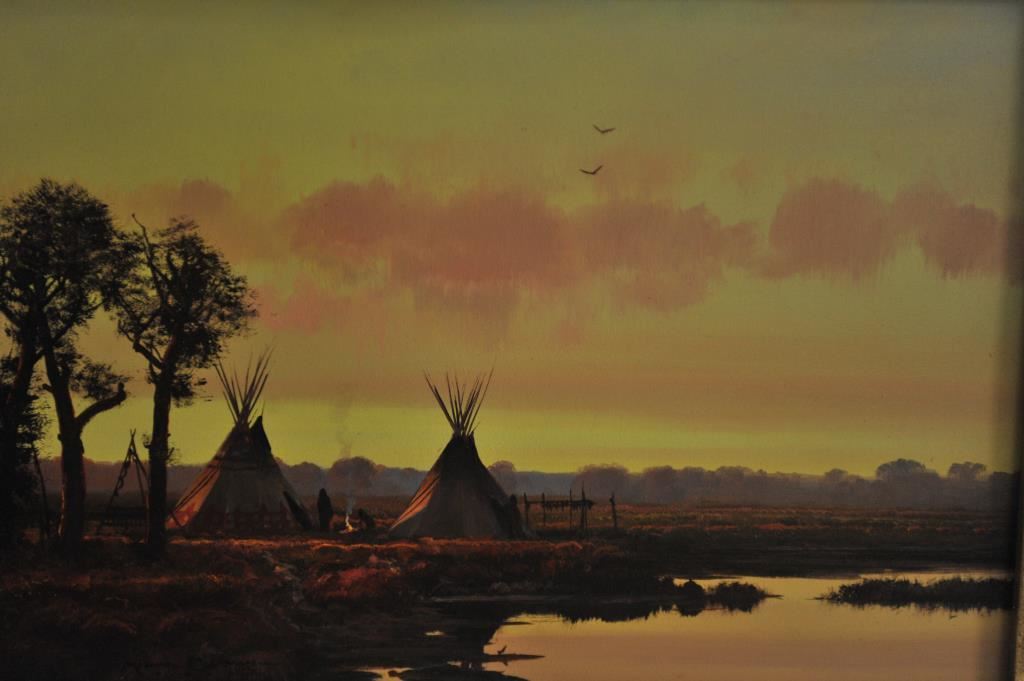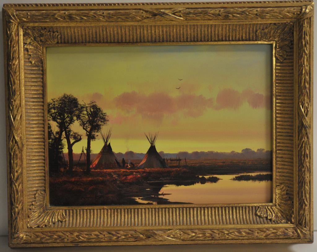Original oil painting on board signed lower left “Michael Coleman”. Measures 9 ½” x 13” image only. Artist framed. Shows Teepee scene with golden skies and fine colors this artist is noted for. A gem by one of Americas top living artists. Est.: $1500-$3000