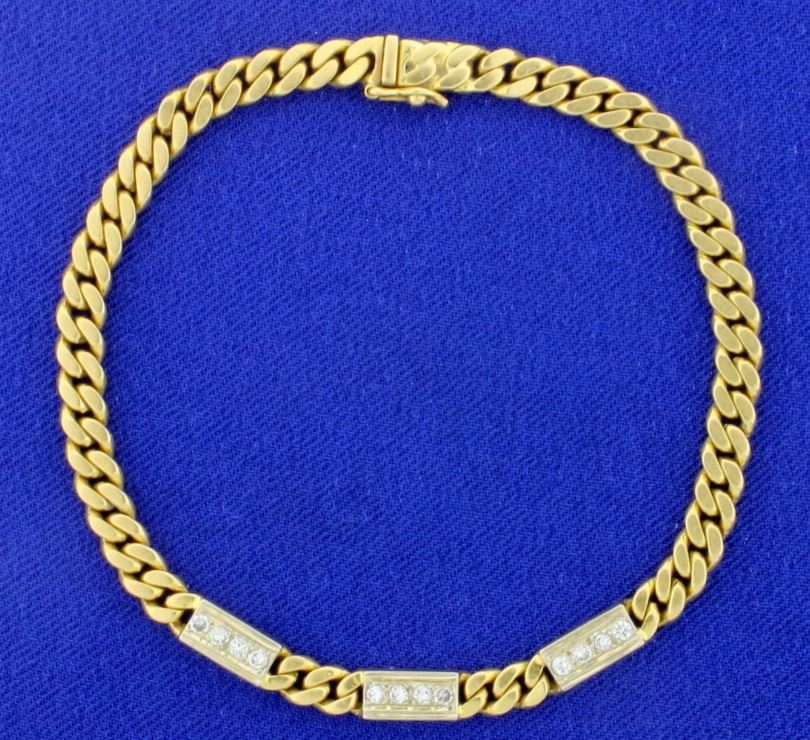 In 18K yellow gold, it is 7 1/4 inches long and contains 1/2ct total weight of high quality diamonds, VS clarity/G color. It has a safety clasp. 15.4g