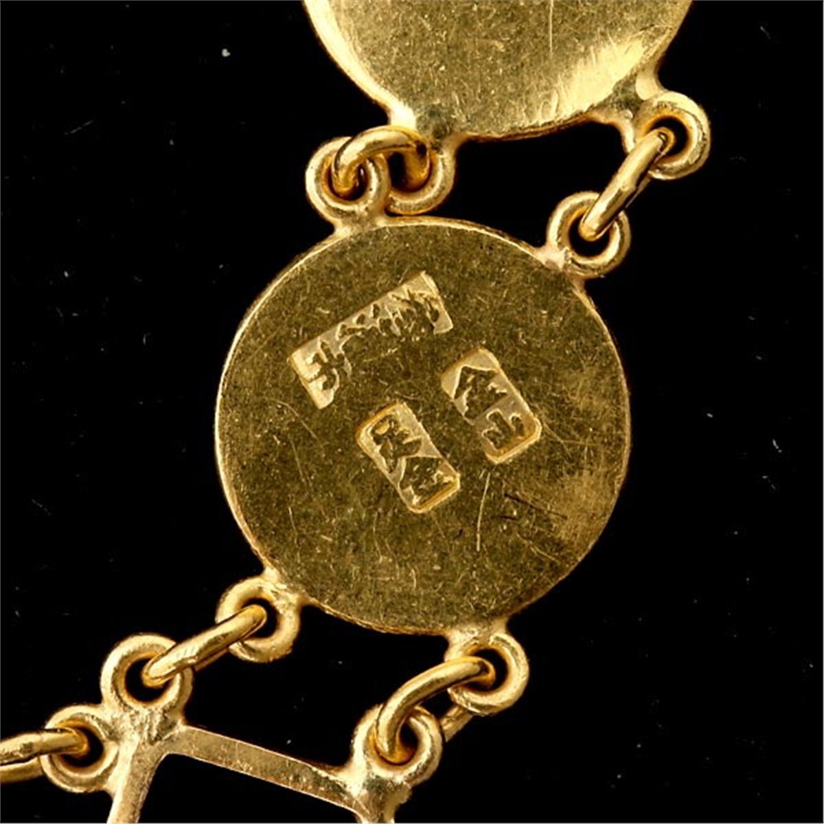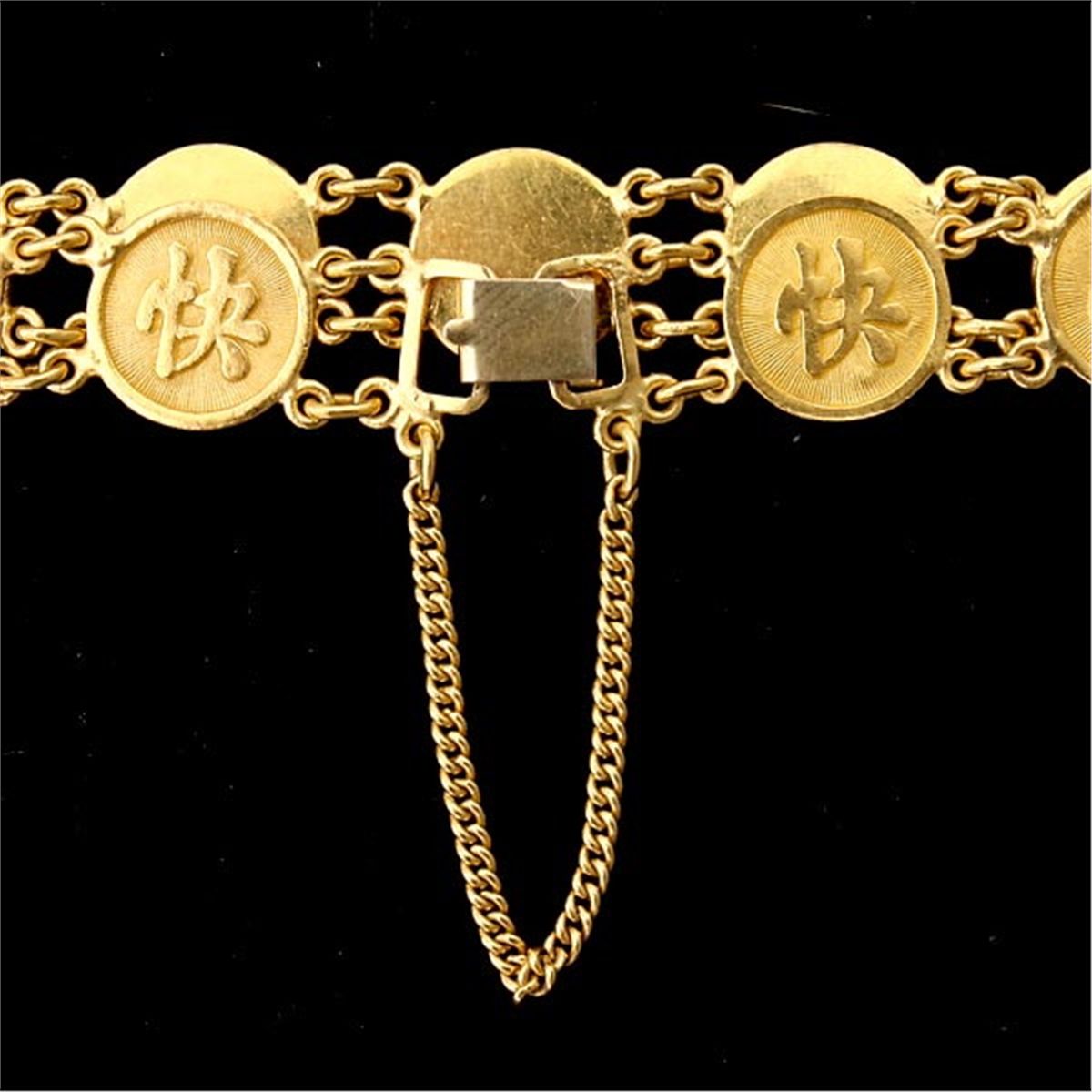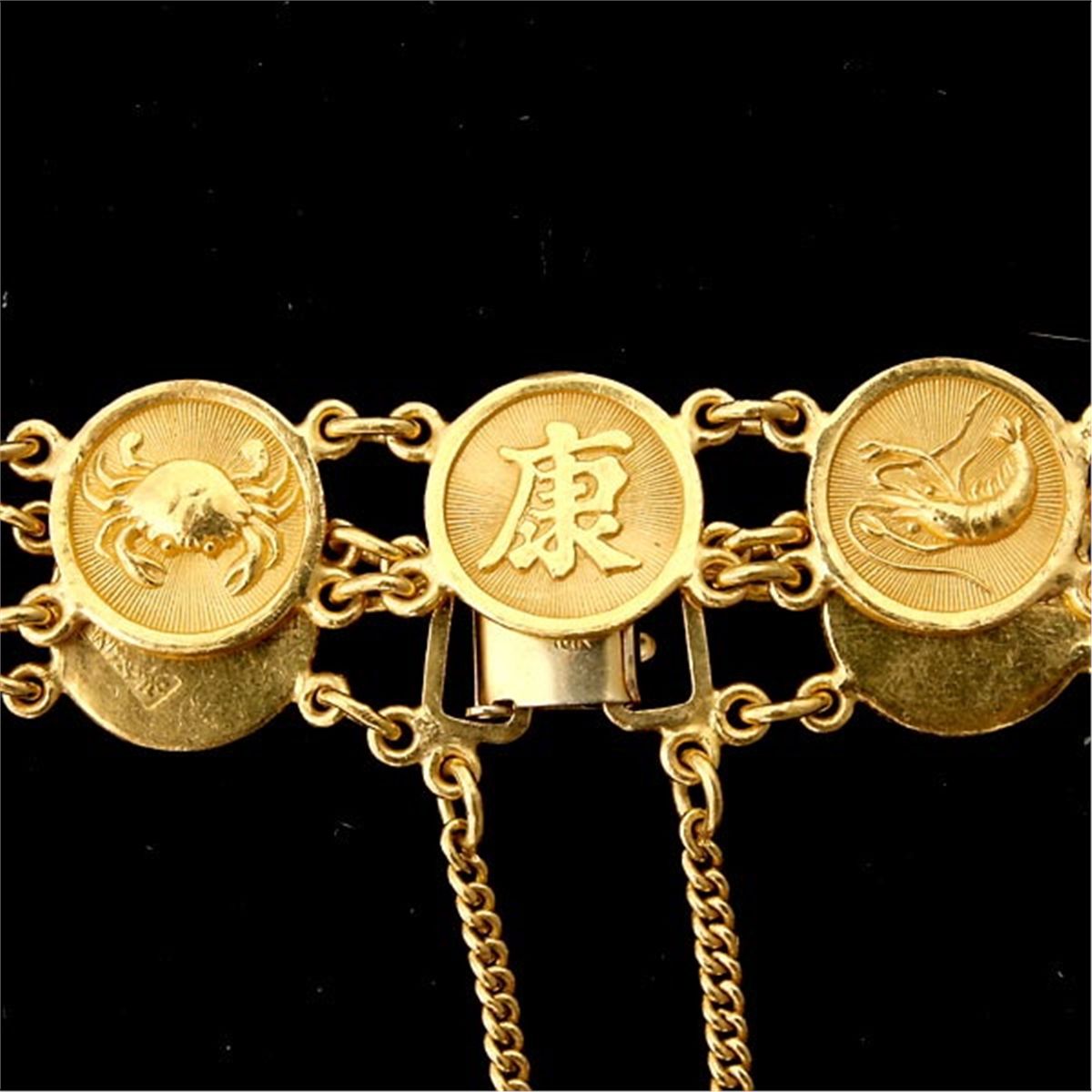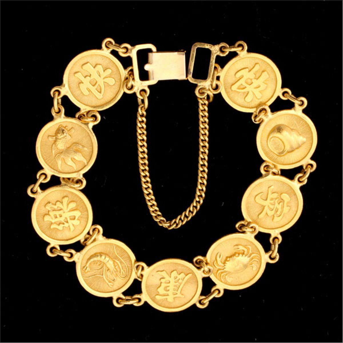 18K, 10K YELLOW GOLD BRACELET. The 18k yellow gold bracelet features nine wire discs depicting Chinese characters, fish, shell fish and a shell, completed by a 10k yellow gold clasp. 20.60 dwts