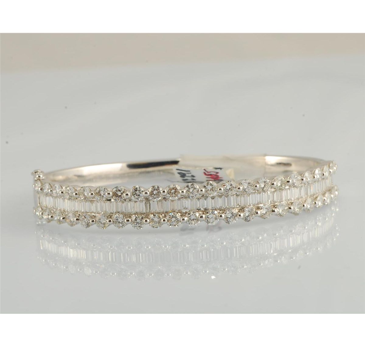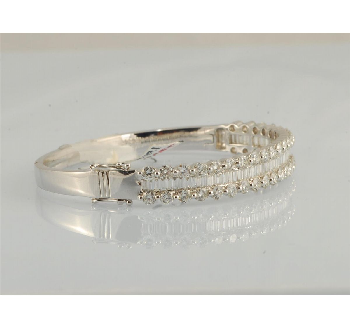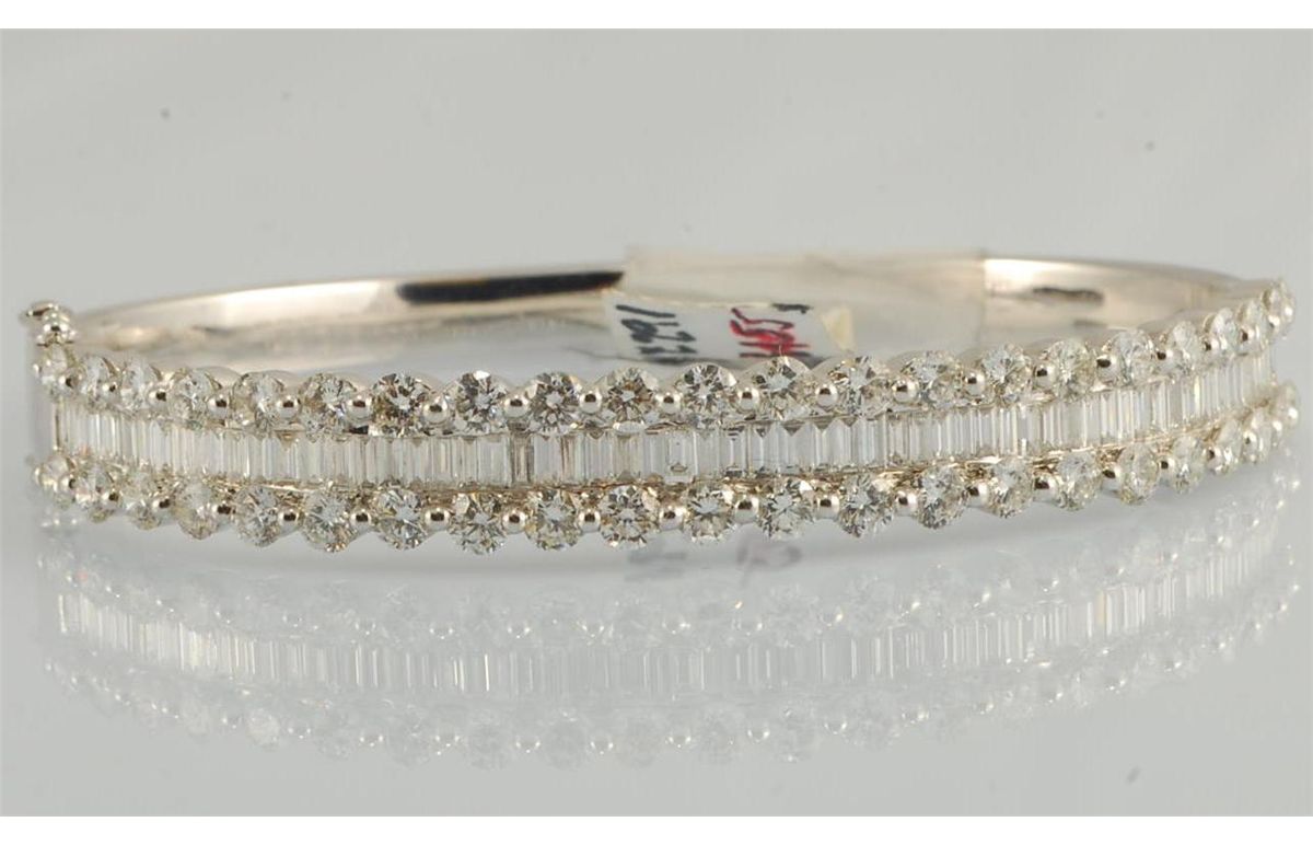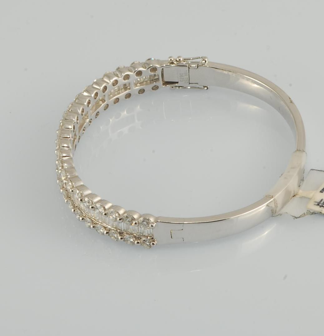 Baguette diamonds set in 18K white gold bangle with rows of round diamonds accenting baguettes. Diamond 6.73 total weight 27.86 grams.