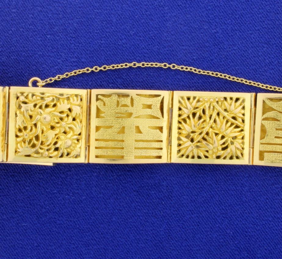 This bracelet is about 2 1/2 inches in diameter and is 3/4 inch wide. Each square has a different Chinese saying expressing happiness, good future, and long life. There is a safety chain. 46.8g