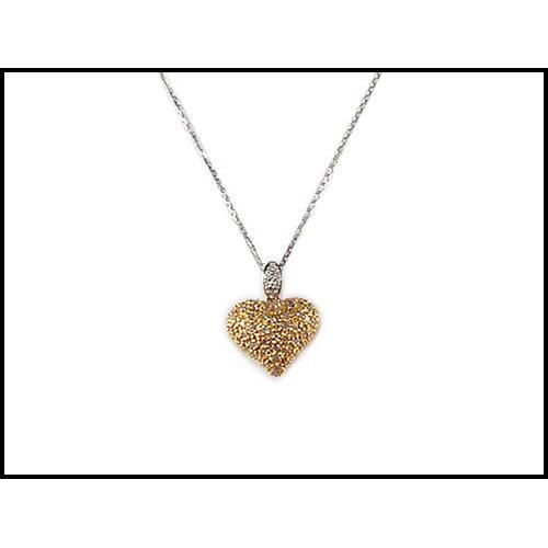 18K white and yellow gold are combined with 68 diamonds in this most unusual and stunning pendant. What catches the eye (that photo does not show) is the beauty of the diamonds, and how they are set. The 18K chain is 16-3/4 inches long. The pendant measures 18mm (11/16?) long. The tag price was more than fair at $895.00, and you can own this charming pendant for a small fraction of that.