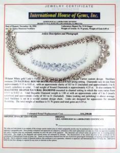18K Diamond Necklacen with Jewelry CertificateThe total weight of necklace is 51 grams.The total diamond weight is 6.05 cts, approxmiately. I color SI1 clarity.The size of pendant: 5mm thick .The necklace is 16" long.