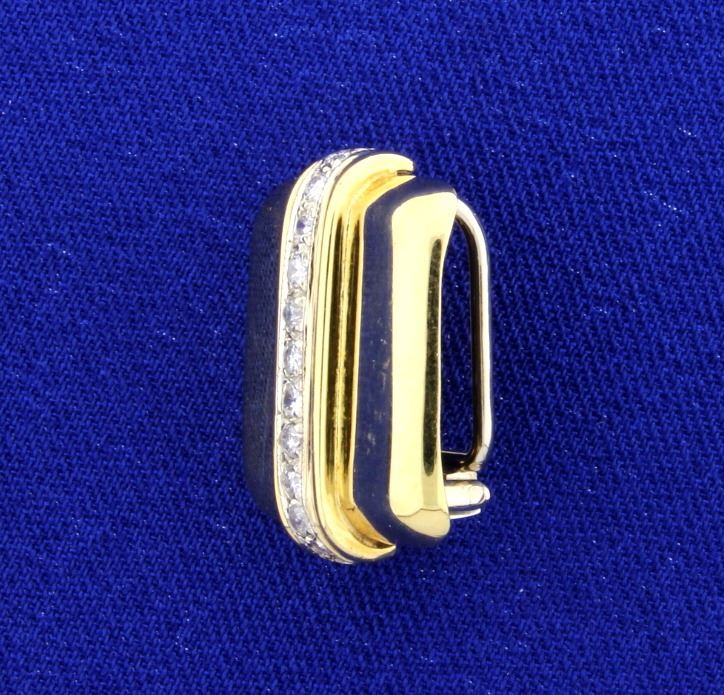 This 18K yellow and white gold slide is 7/8 inch long. It can accommodate omega up to 14mm thick. It contains 1/4ct total weight of high quality diamonds, that are F color/SI clarity. 6.3g