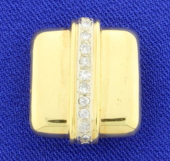This 18K yellow and white gold slide is 7/8 inch long. It can accommodate omega up to 14mm thick. It contains 1/4ct total weight of high quality diamonds, that are F color/SI clarity. 6.3g