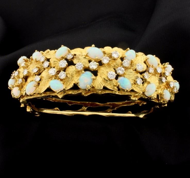 In 18K yellow gold, it is 2 1/2 inches in diameter. It contains sixteen 6 to 7mm oval opals with excellent color of play. It also contains over 2cts of high quality diamonds ranging from .05 to .1cts of high quality each, which are SI to VS clarity/G to H color. 47.4g